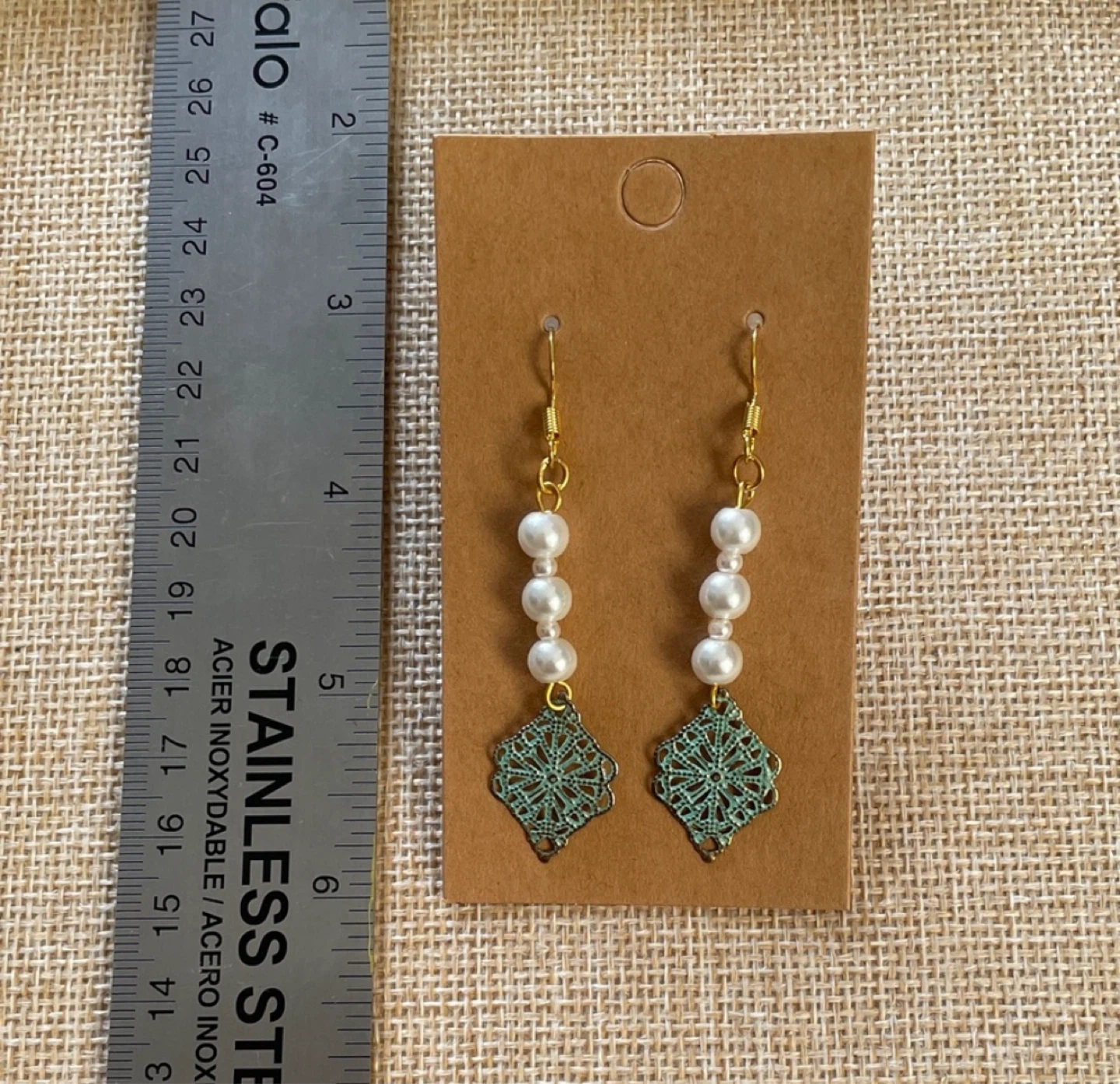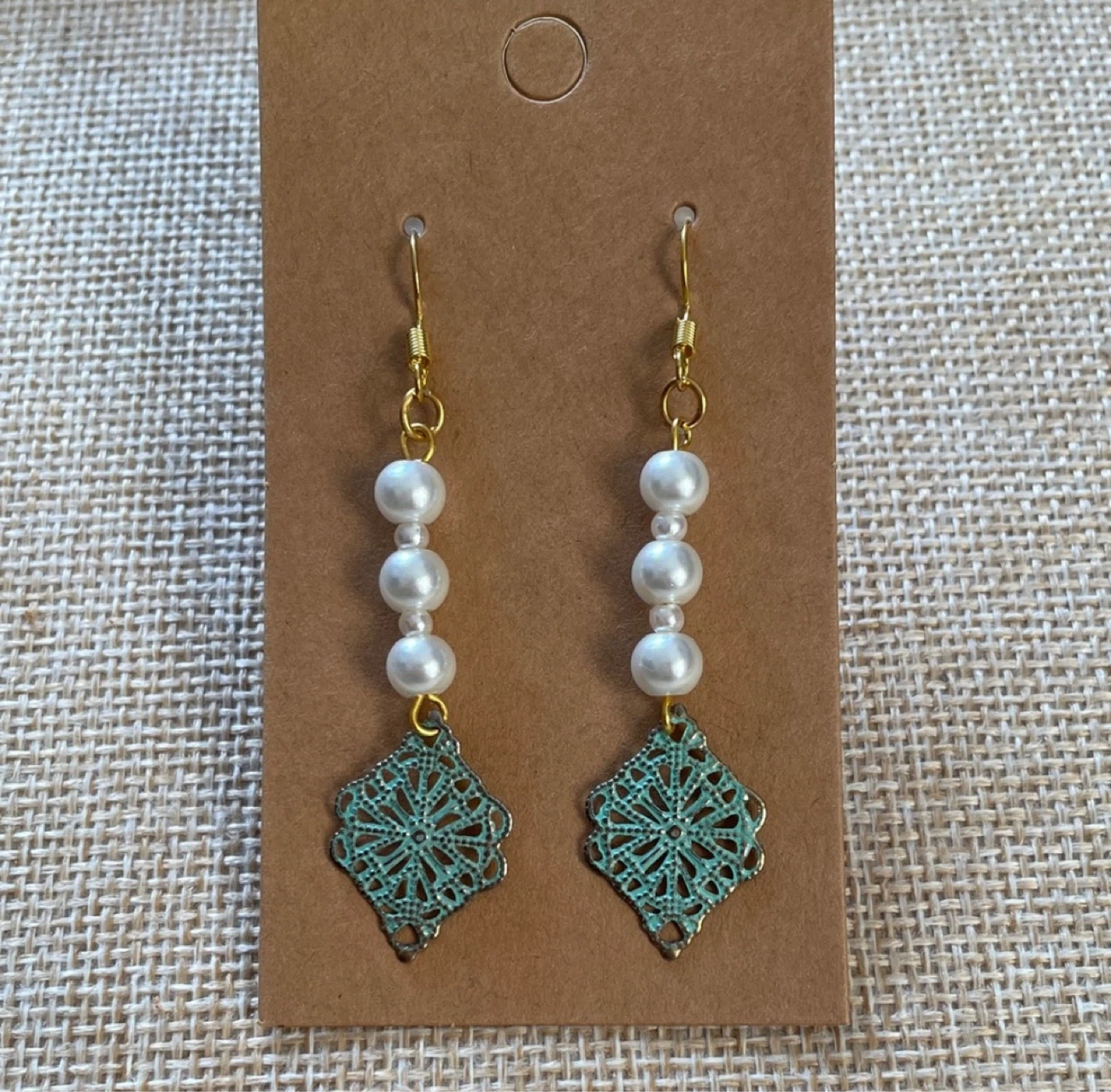 These dangle earrings feature three white faux pearls on each side. They hang from gold-tone hooks and have intricate turquoise-coloured filigree diamond charms at the bottom. These would add a touch of elegance to any outfit!