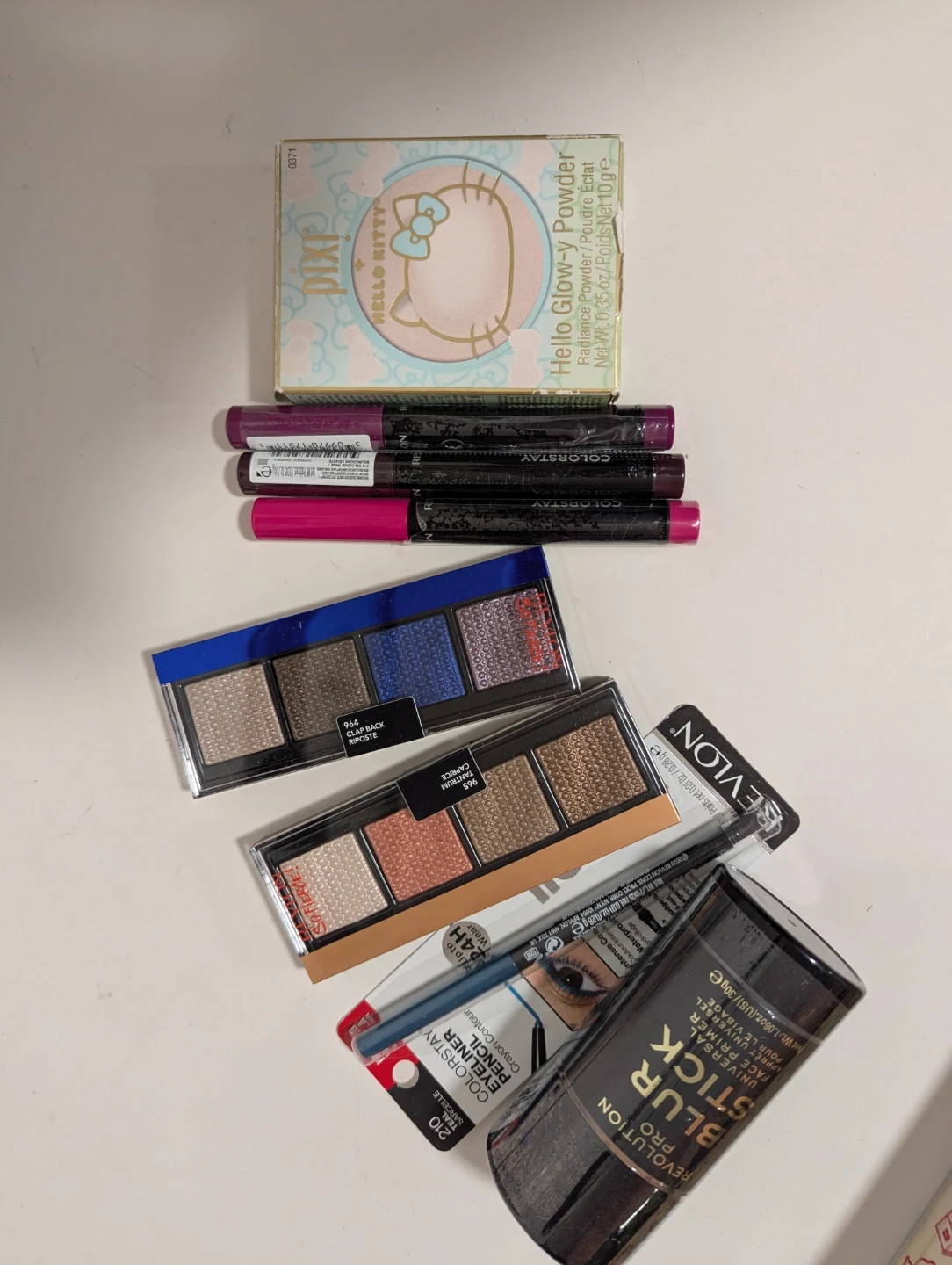 Includes a Pixi x Hello Kitty Glow-y Powder and several ColorStay eyeliners and Revlon makeup. There are also two eyeshadow palettes. Great for a makeup enthusiast!