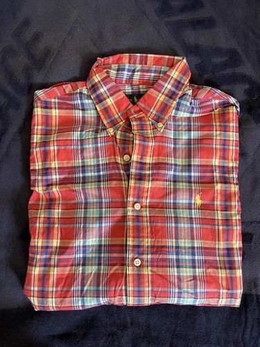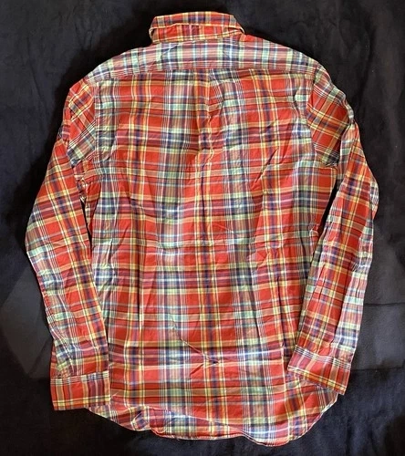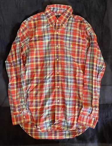 This is a Ralph Lauren plaid long sleeve button-down shirt in size M. It is 100% authentic and made from high-quality materials. The shirt features a classic button-down collar and a comfortable regular fit, perfect for casual wear. The multicolor plaid pattern adds a touch of style to this versatile wardrobe staple.
