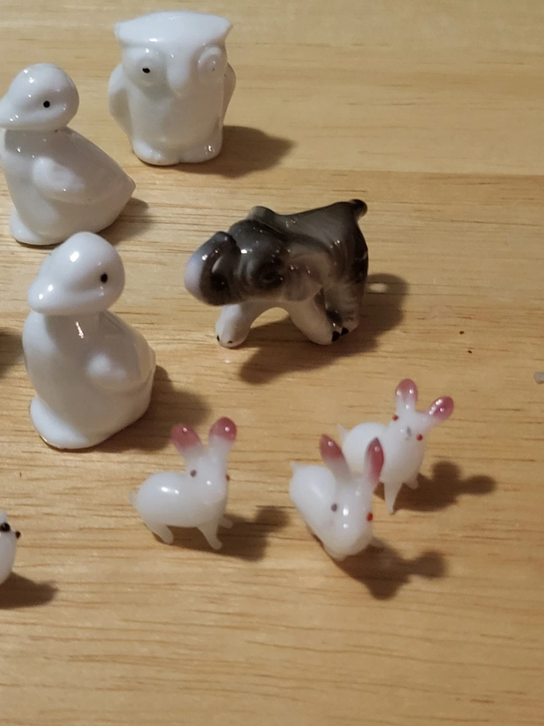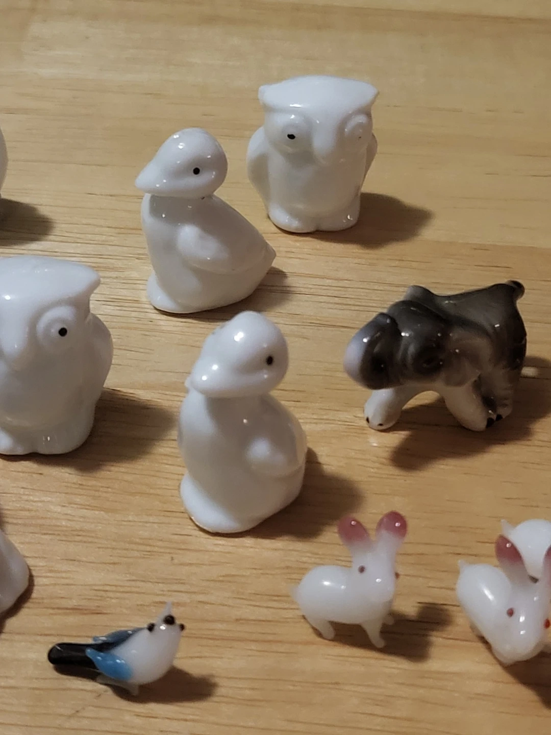 A charming collection of twelve small glass animal figurines. It includes various animals like rabbits, owls, ducks, and a bird. These tiny creatures are perfect for decorating a shelf or adding a whimsical touch to any space!