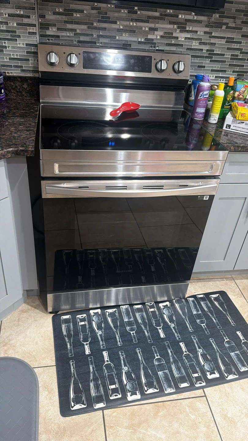 Stainless steel electric range with a smooth glass cooktop. It has a large oven capacity and a warming drawer. This range's sleek design complements any kitchen.