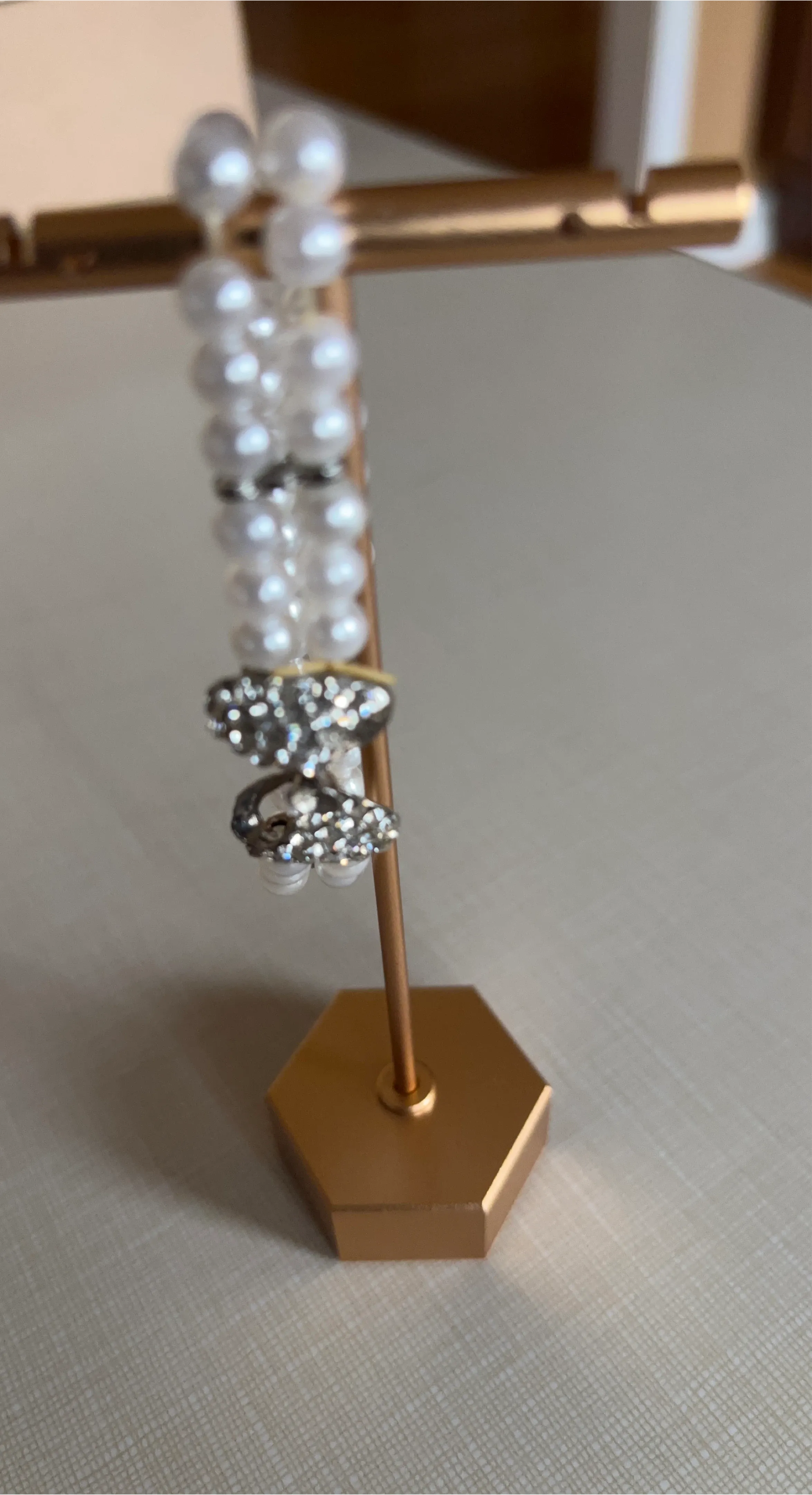 This is a lovely pearl bracelet with sparkling rhinestone accents. It features faux pearls strung together with silver-toned spacers and a dazzling cluster of rhinestones. It's a stylish accessory for any occasion!