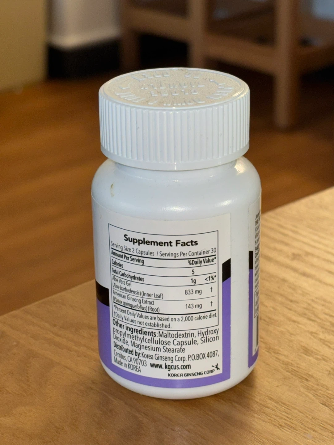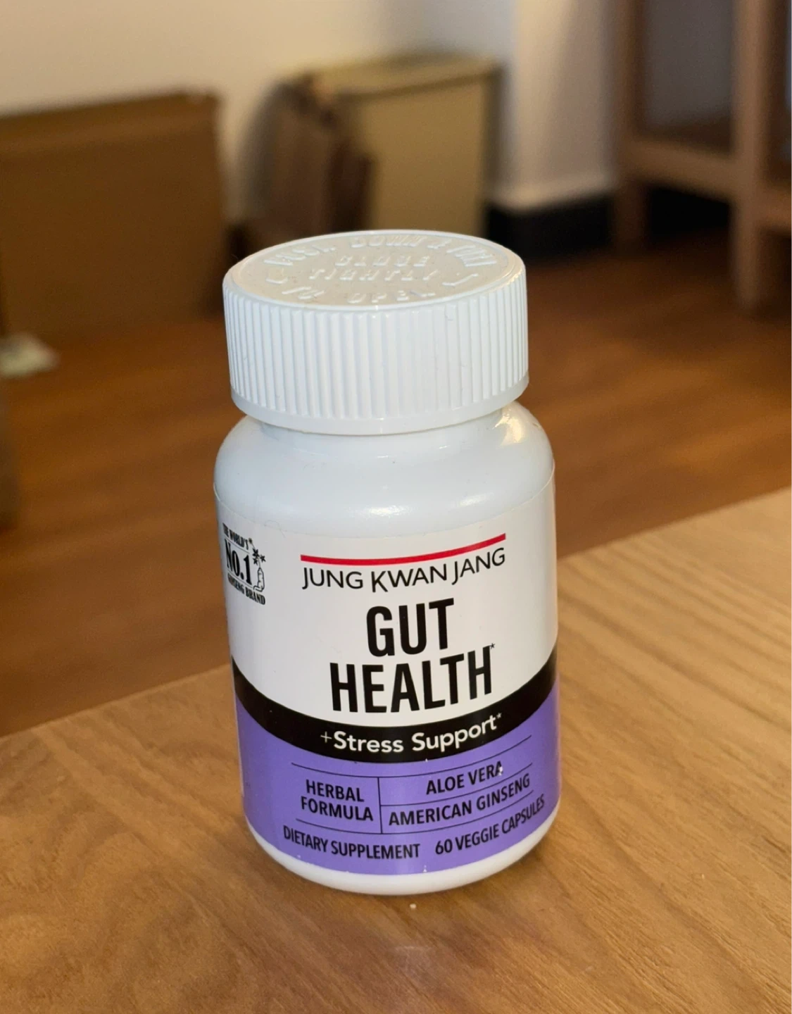 Jung Kwan Jang Gut Health supplement with stress support. Features a herbal formula with Aloe Vera and American Ginseng. Contains 60 veggie capsules. Expires 31/07/2026.