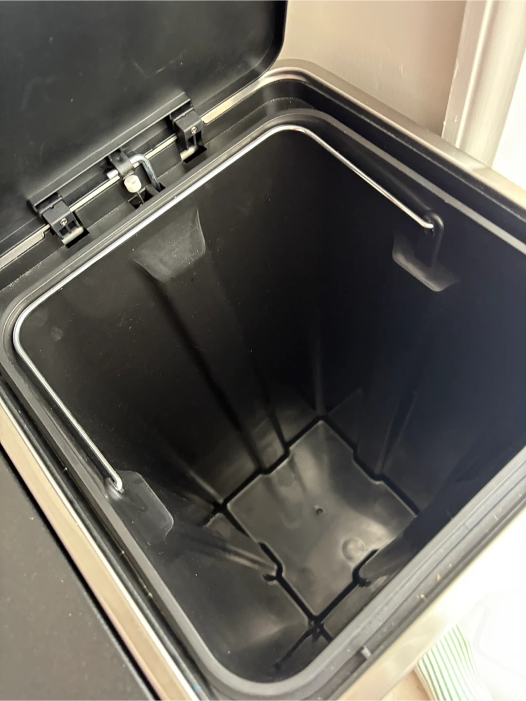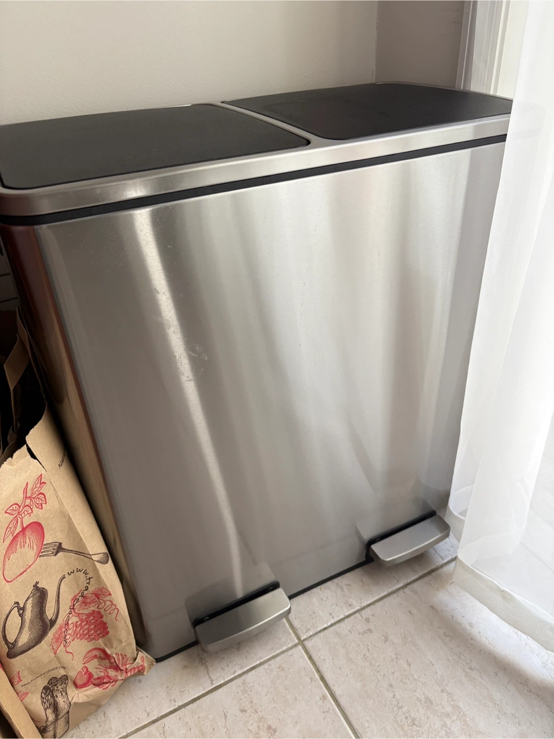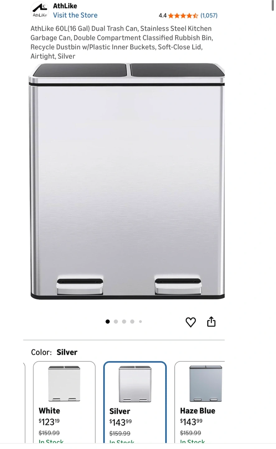 This AthLike dual compartment kitchen trash can holds 60 liters total. It's made of stainless steel and includes two plastic inner buckets. The lid is soft-close and the bin is airtight.
