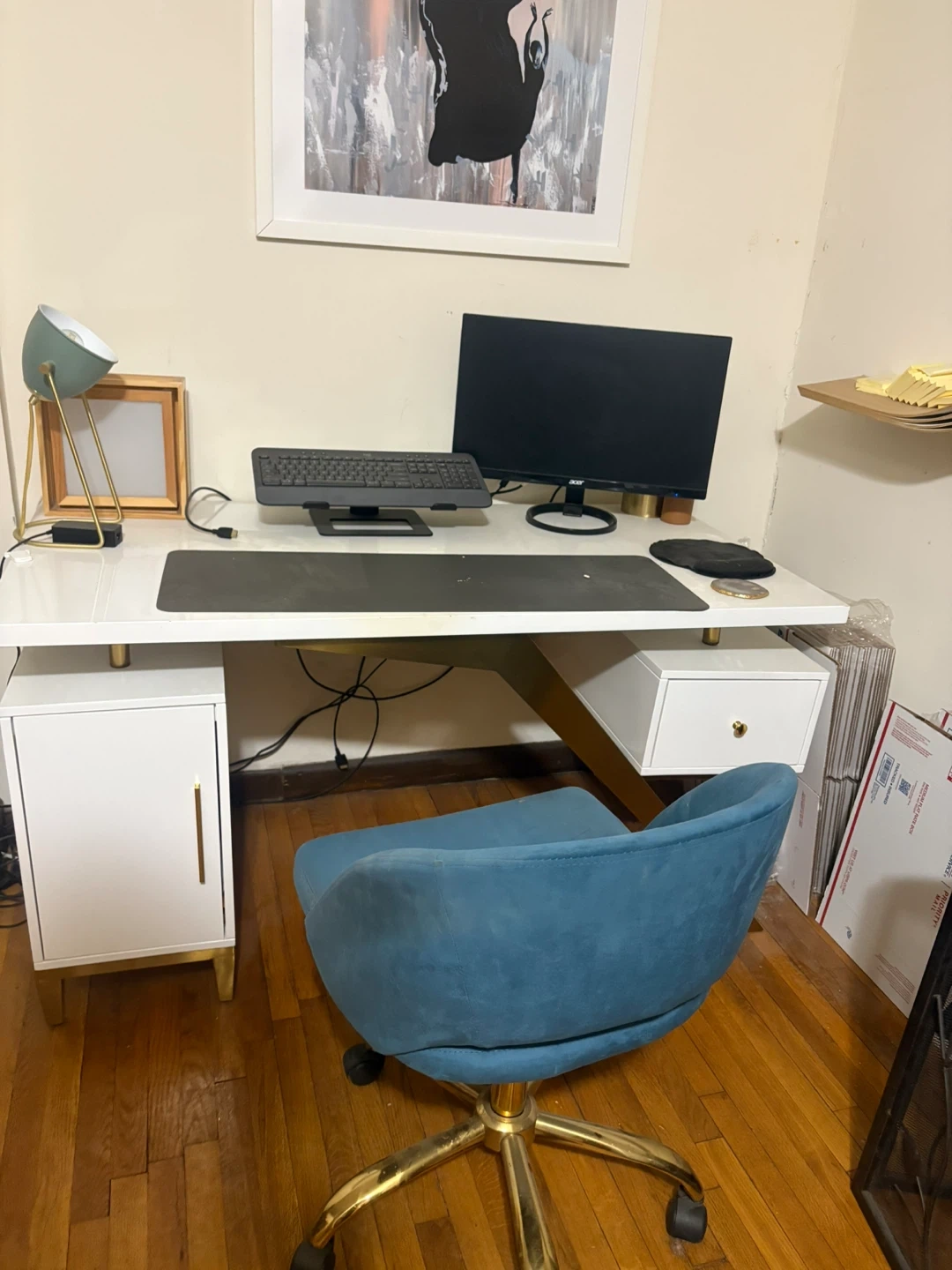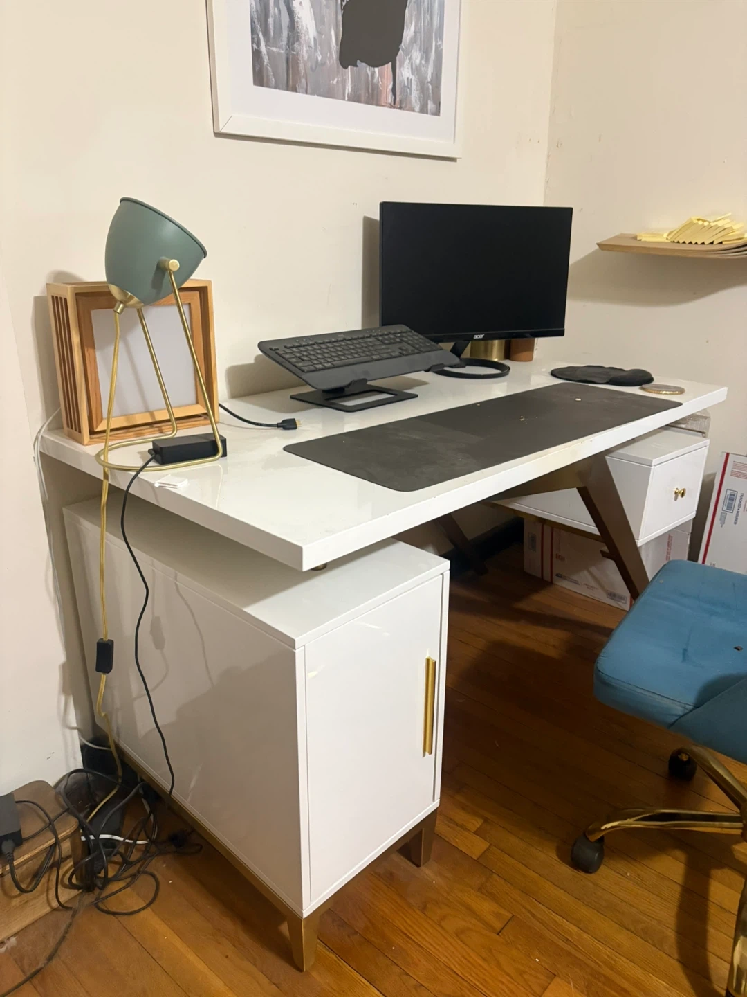 This modern desk features a sleek white finish with stylish gold accents on its legs and drawer pulls. It offers ample workspace and includes two storage units, one with a cabinet door and the other a drawer. It's perfect for a home office setup. White laminate finish. Gold metal legs and hardware. Two storage compartments. Original price was 800