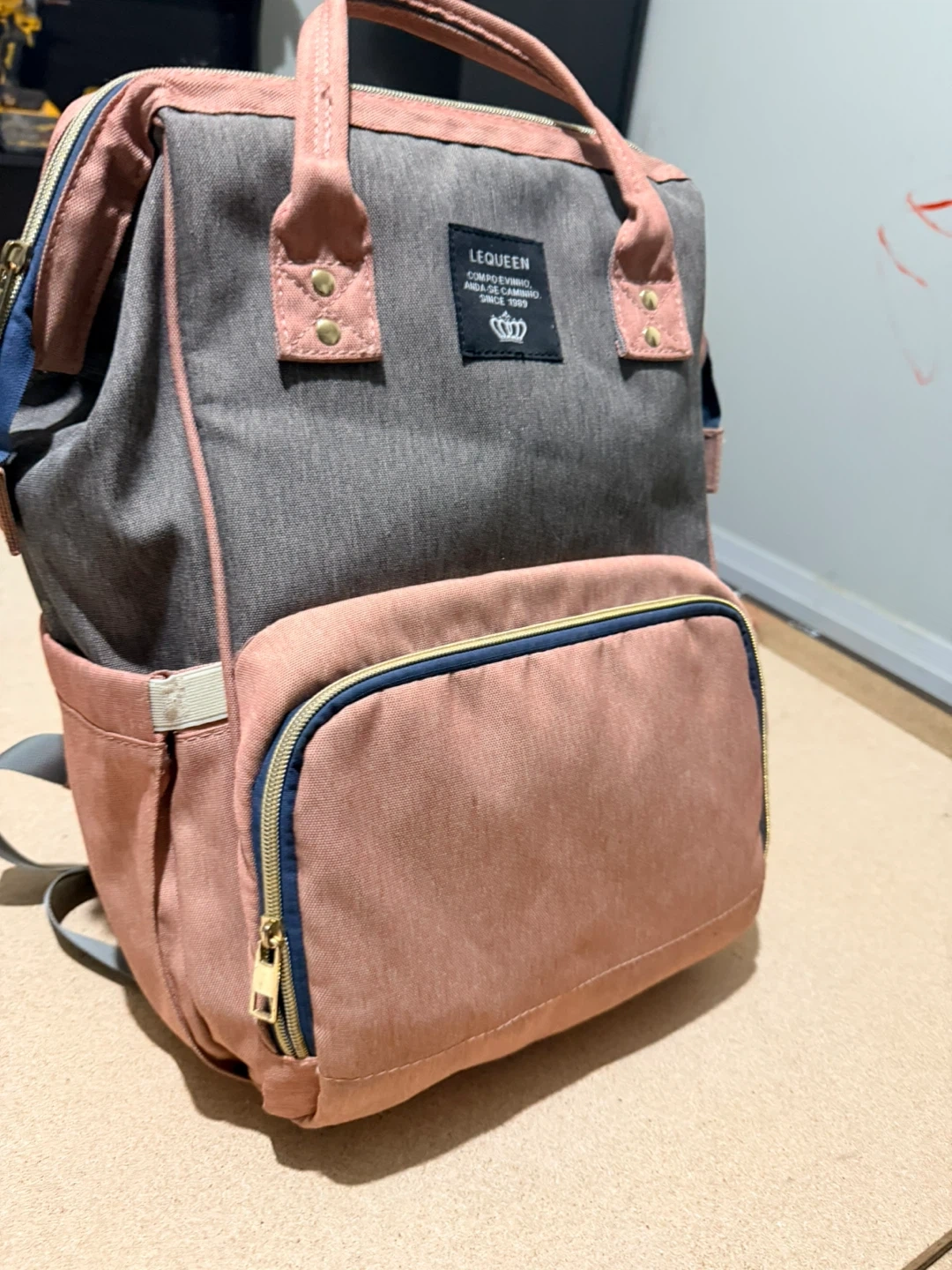 This LEQUEEN diaper backpack comes in a stylish pink and grey colourway. It's made with durable fabric and features multiple pockets for organization. This bag is super practical for parents on the go!