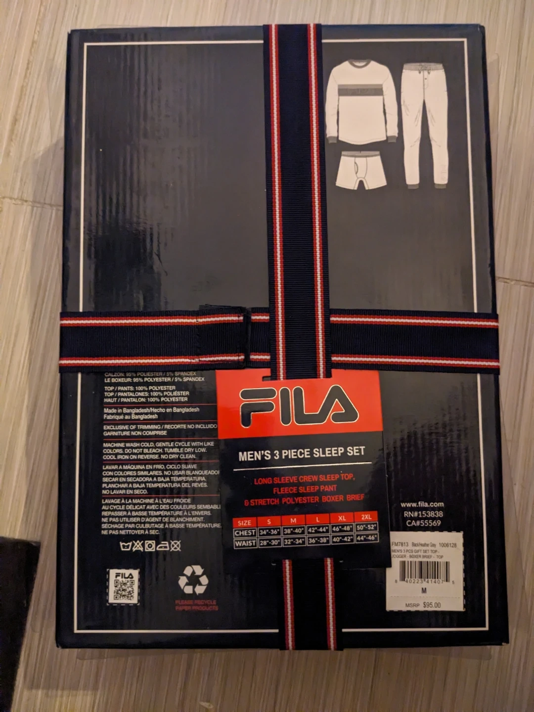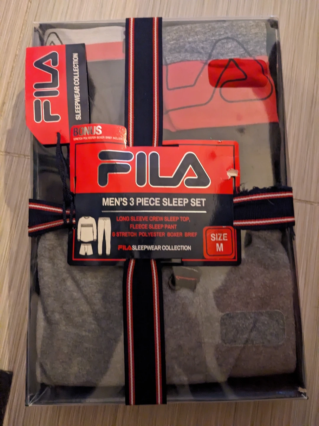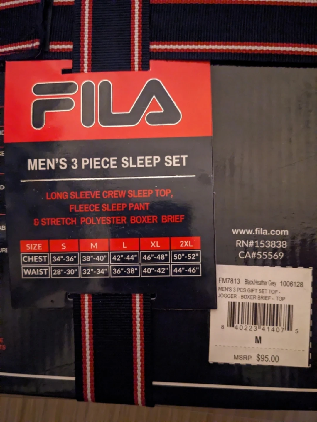 This is a Fila men's 3-piece sleep set. It includes a long sleeve crew neck sleep top, fleece sleep pant, and a stretch polyester boxer brief. The set is size medium.