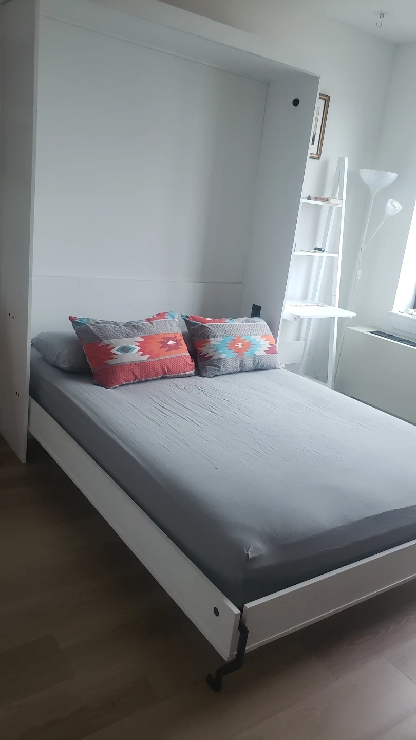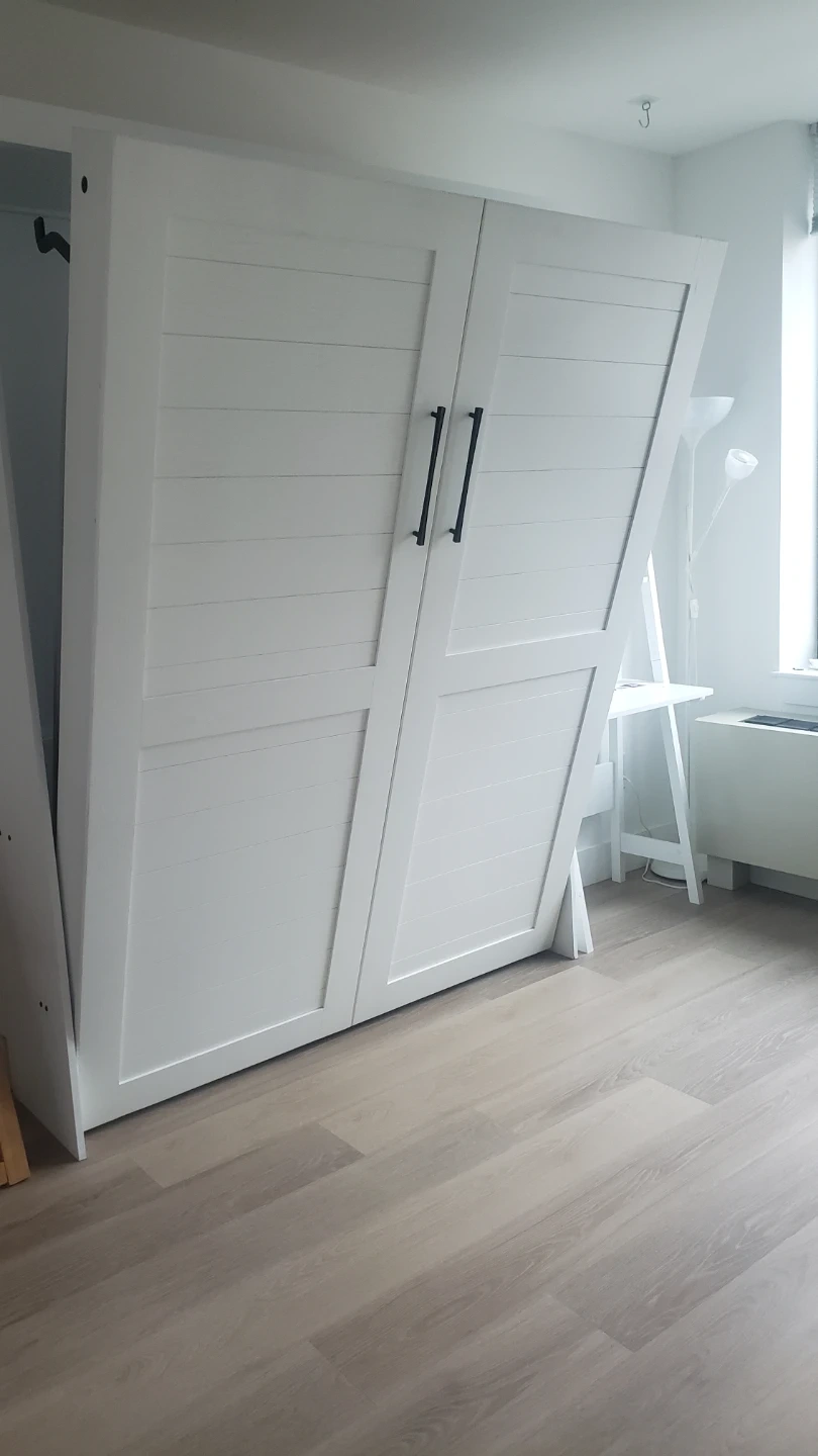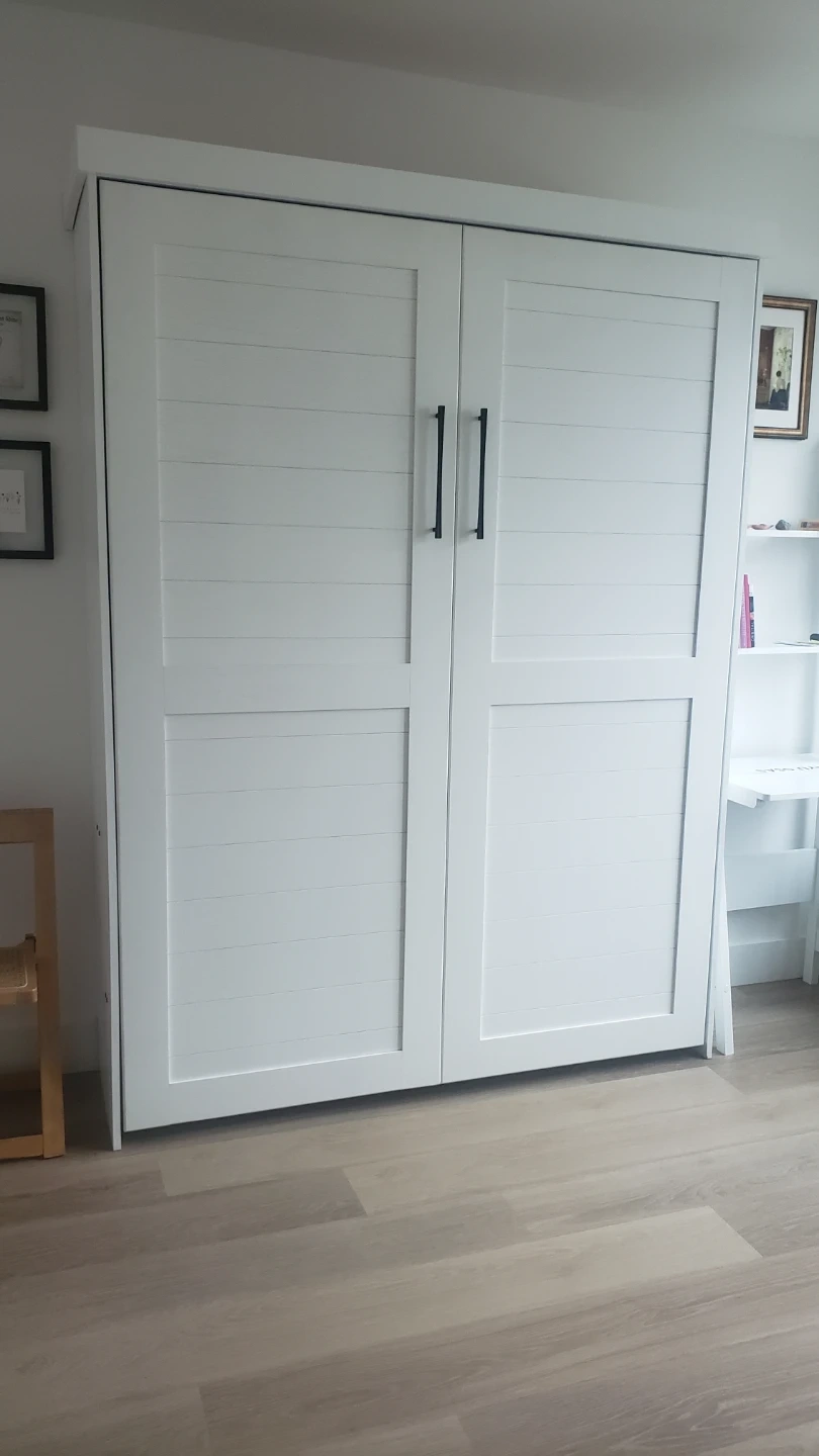 This is a white wall bed with a Queen mattress included. It's designed to fold up into a cabinet for space-saving. The bed has a clean, modern look with plank-style doors. This is made from real wood and is great for rental spaces