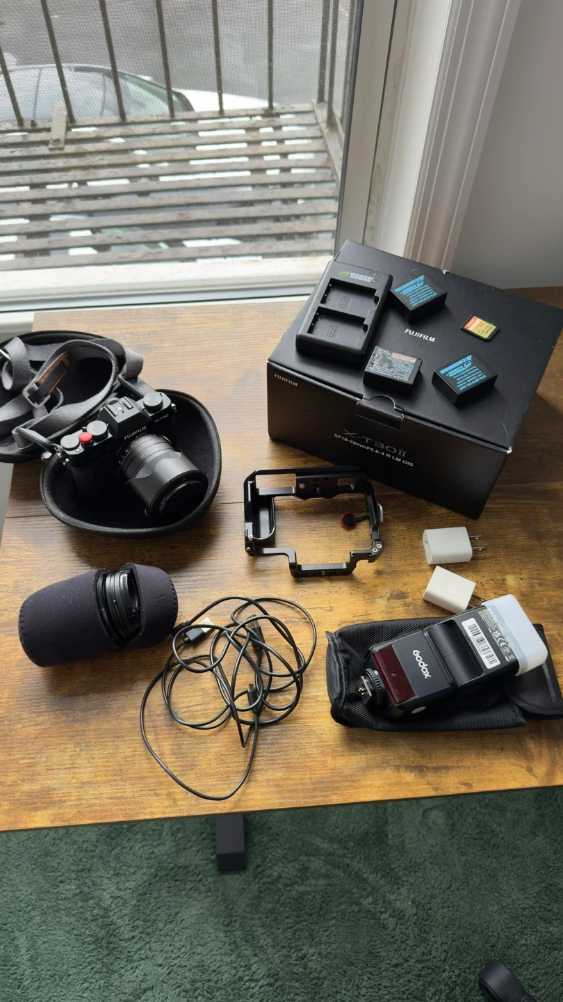 Selling a Fujifilm X-T30 II camera. It comes with a AF 33mm f/1.4 lens, a XF 18-55mm lens, flash GODOX, a metallic cover for the camera, hard case for the camera, a Wasabi Power battery charger, three batteries,a 128GB SanDisk Extreme SD card, cables,Also includes the box and receipts!