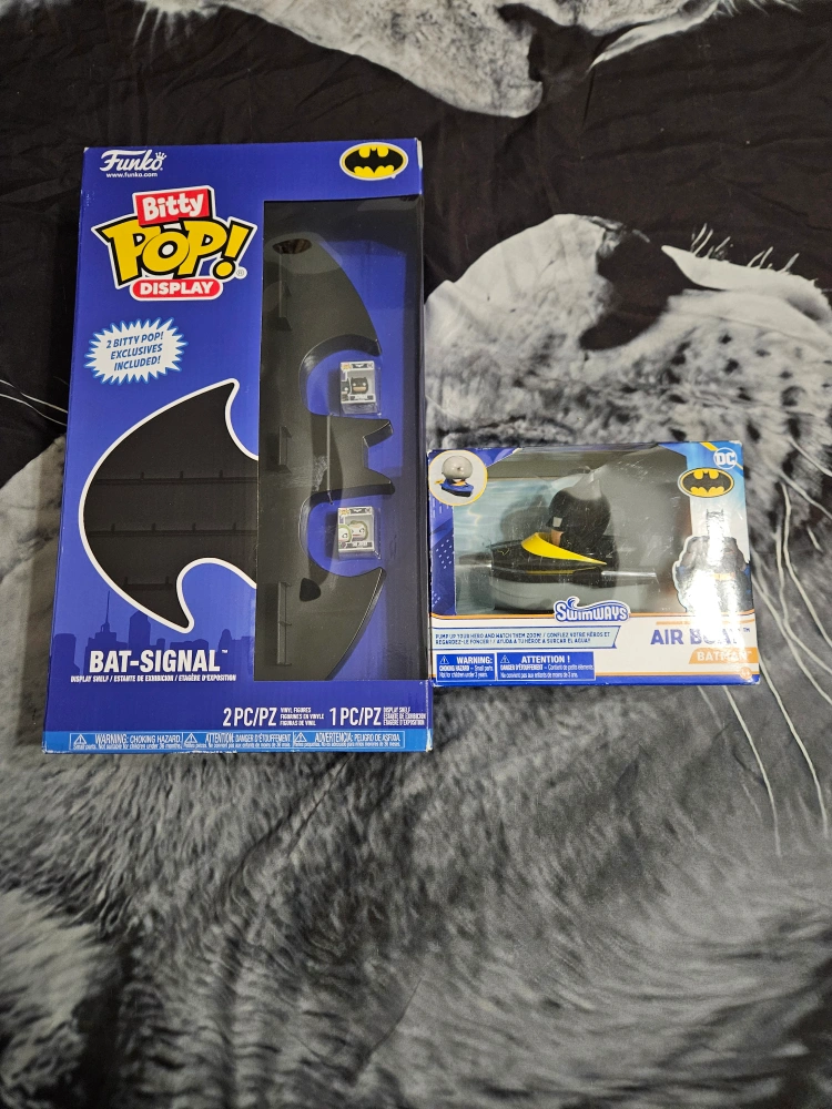 Selling a Funko Bitty Pop! Display Bat-Signal, which includes 2 Bitty Pop! exclusives. Also included is a SwimWays Air Boat Batman figure. Both are in their original packaging PICK UP ONLY