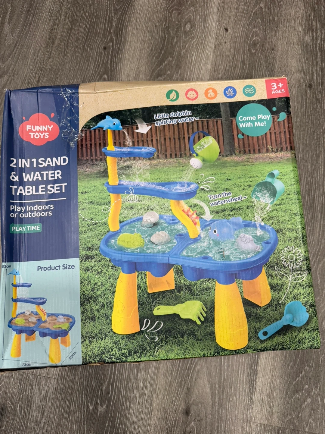 5This Funny Toys 2 in 1 Sand & Water Table Set is brand new in its original box! It's perfect for playtime, whether indoors or outdoors. The set features a little dolphin that spits water and a waterwheel for added fun. Recommended for ages 3+