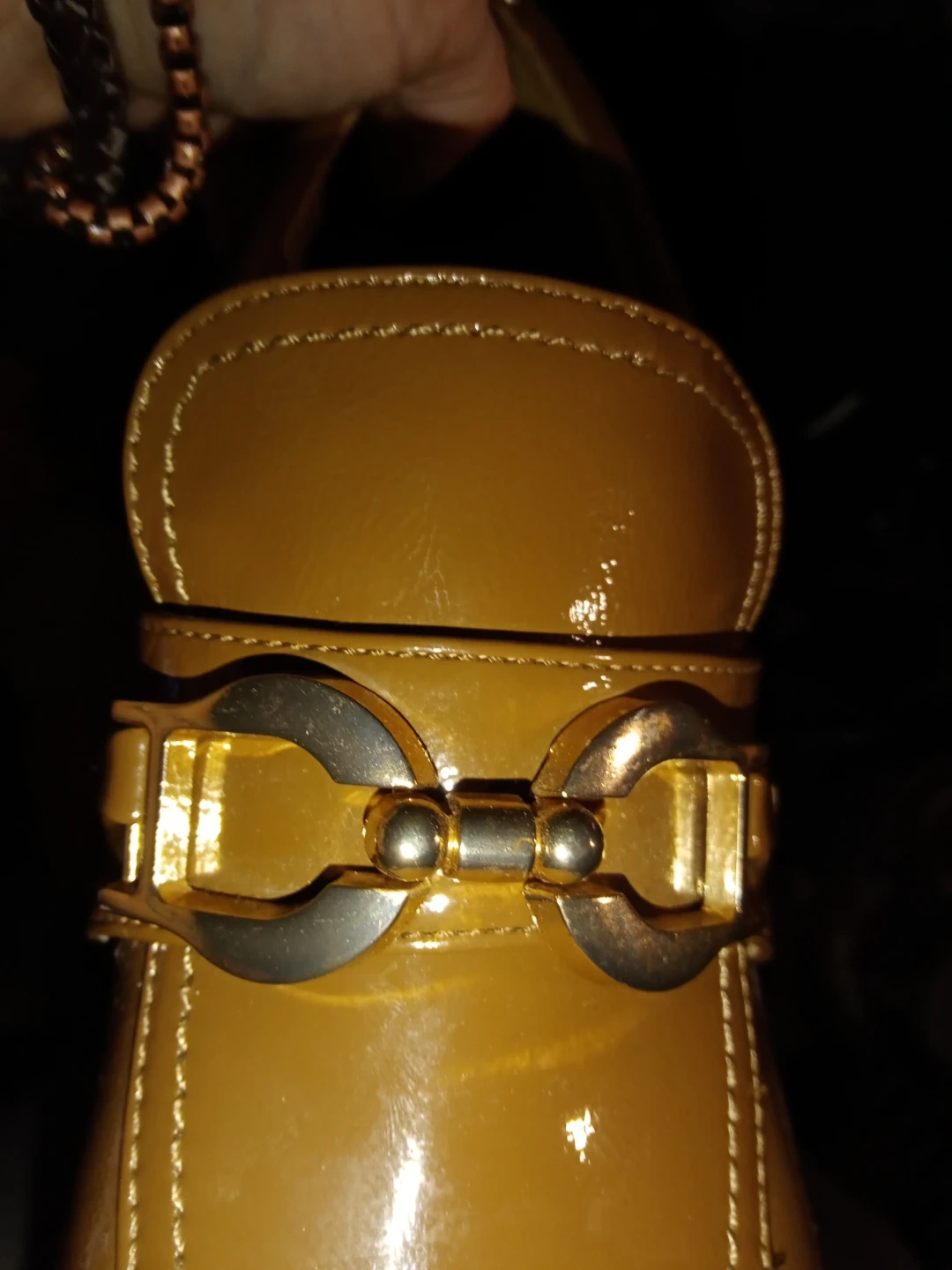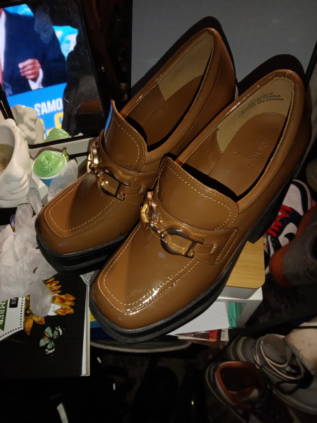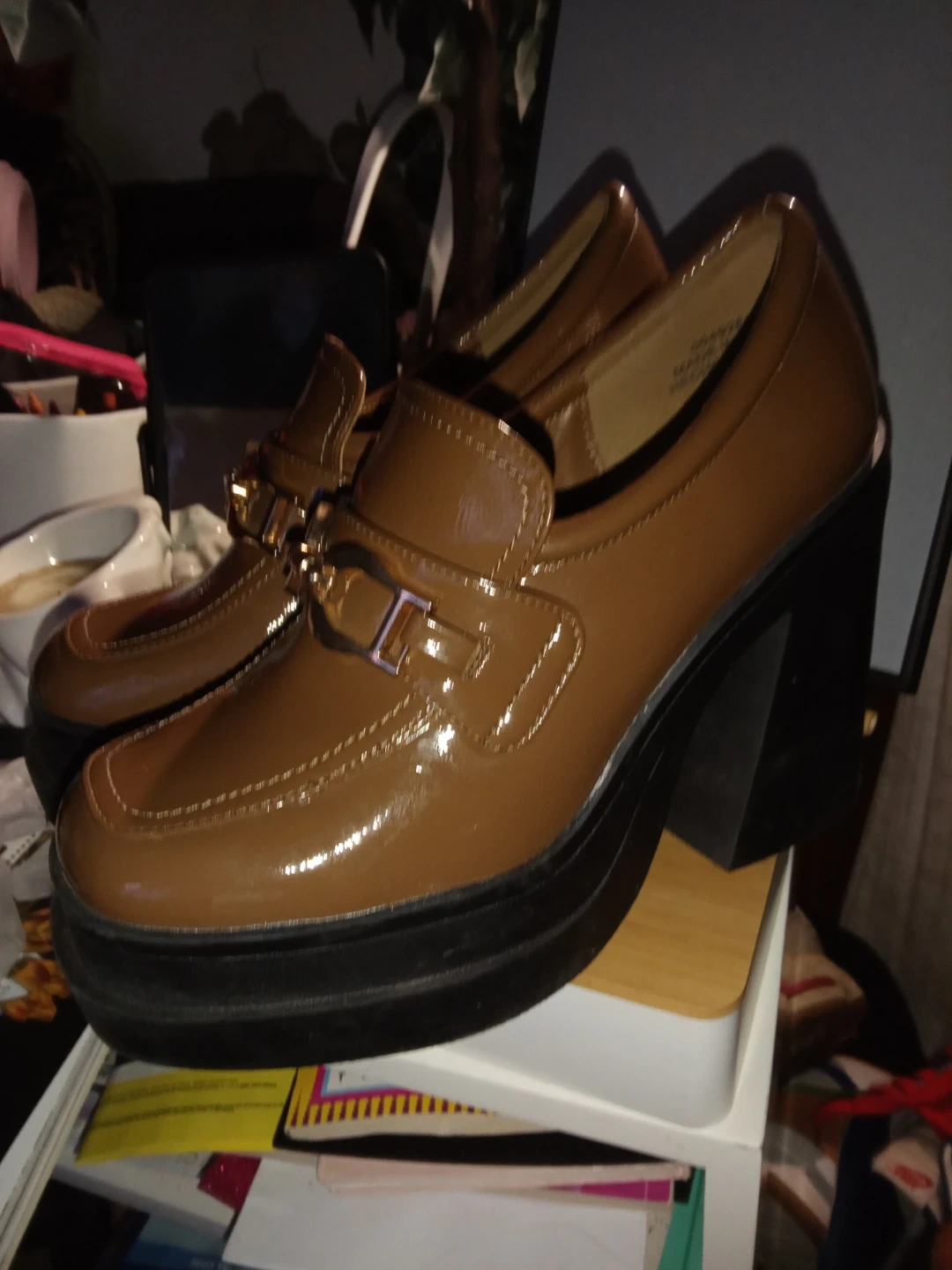 These stylish loafer heels feature a glossy brown patent finish with gold hardware. They offer a comfortable fit with a platform sole and block heel. Size US/CA 6.5.