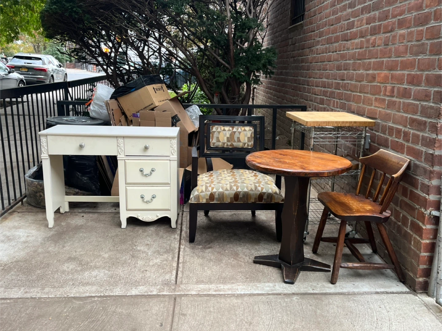 25Free furniture set that includes a white desk with drawers, a patterned chair, and a round wooden table. All items are in good condition and ready for a new home! The items are at 8105 4th Avenue corner of 82nd street (side of back yard). They are displayed nicely if anyone is interested.