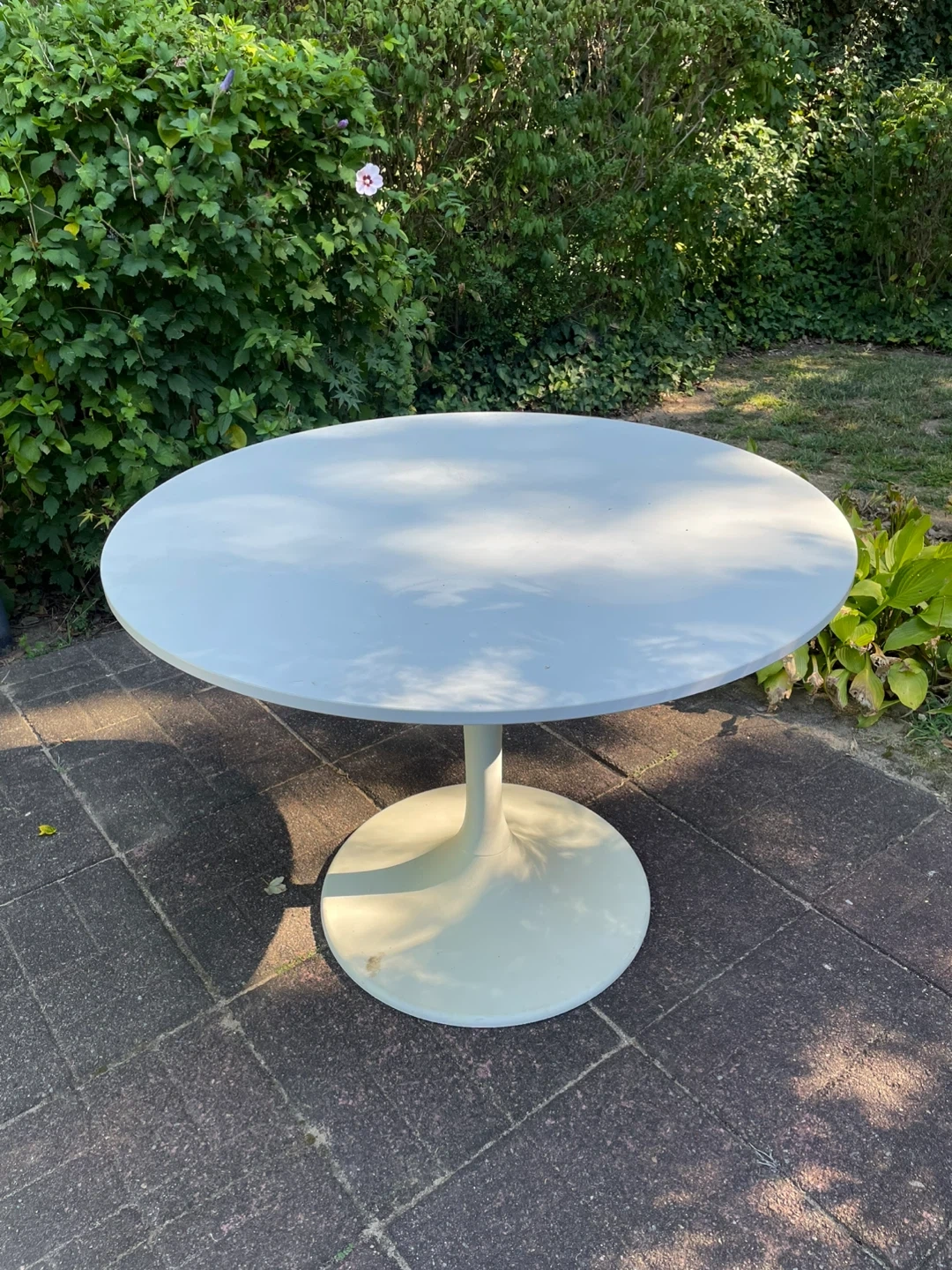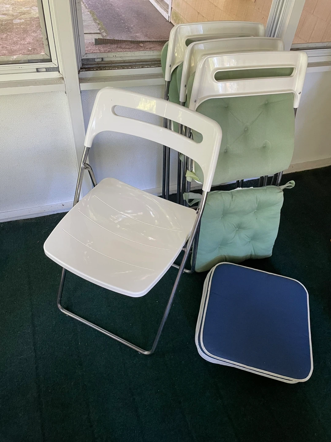 89A set of furniture including a round table and folding chairs. Perfect for a dining area or patio. The chairs are white with cushioned seats. Will separate if you don’t want both Must be picked up ..cannot ship