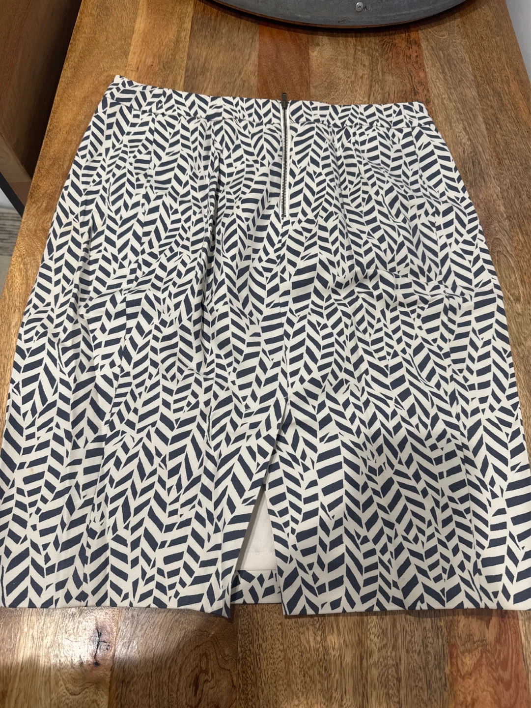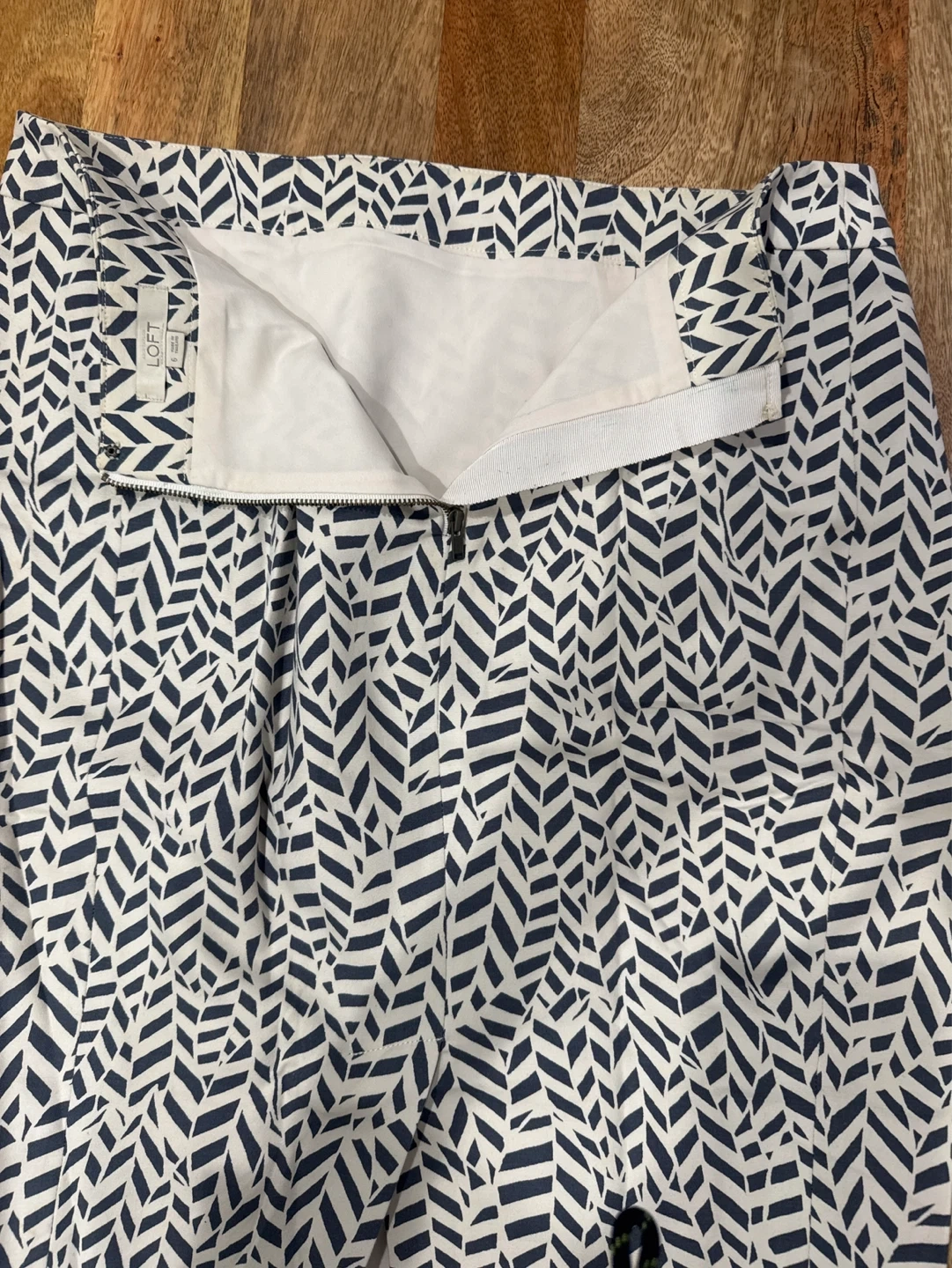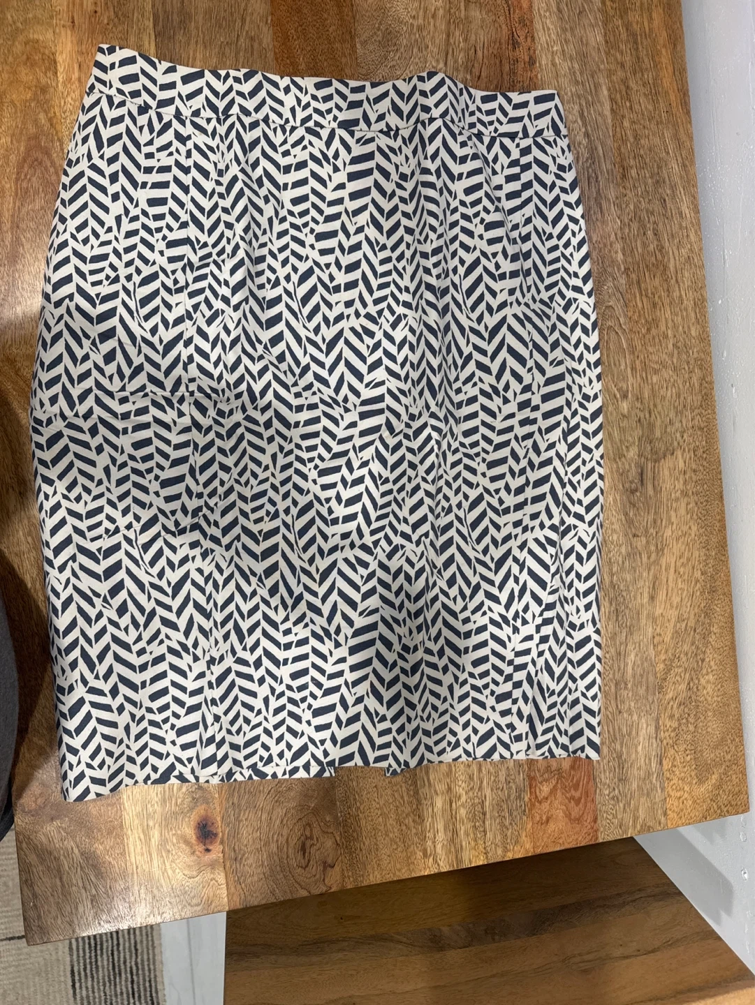 This is a Loft pencil skirt with a navy and white geometric pattern. It features a zip closure at the back. The material is a blend, making it comfortable for everyday wear.