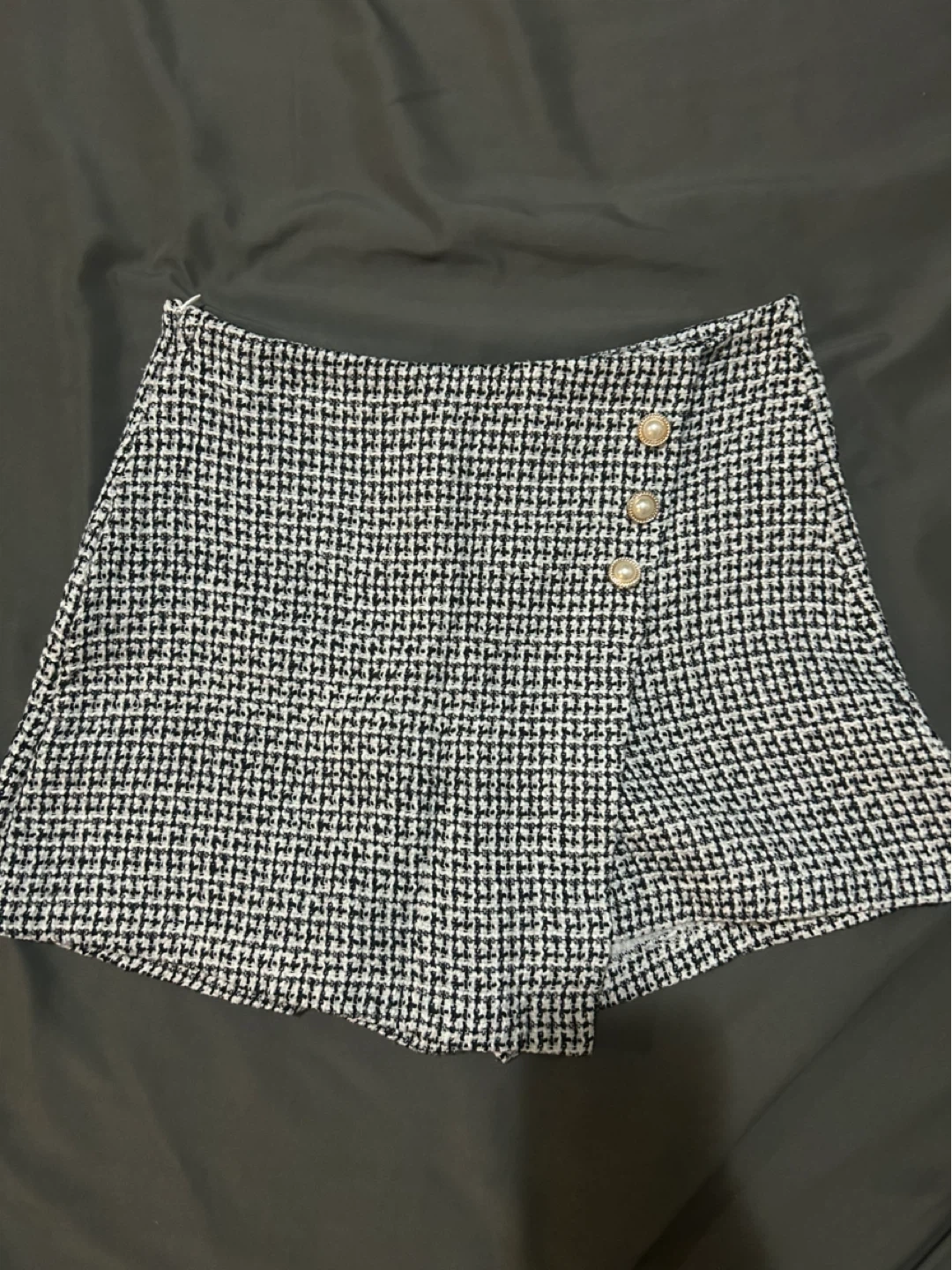 Selling a cute tweed skort! It features a stylish tweed pattern and has pearl button detailing. Perfect for adding a touch of elegance to your outfit. It's in great condition and ready for a new home!