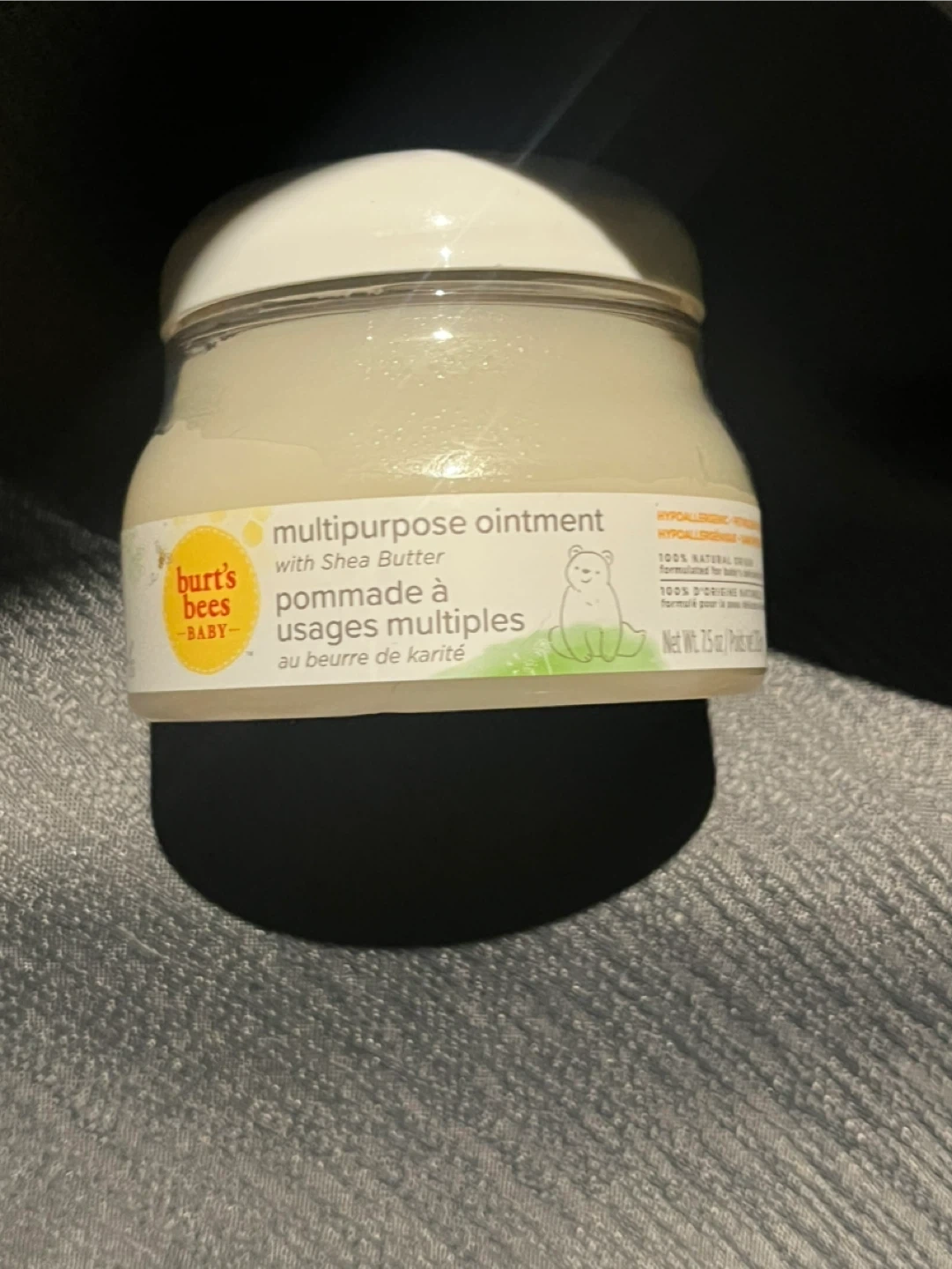 Burt's Bees Baby multipurpose ointment with Shea Butter. Hypoallergenic formula, 100% natural ingredients. Net Wt. 7.5 oz / 212 g.