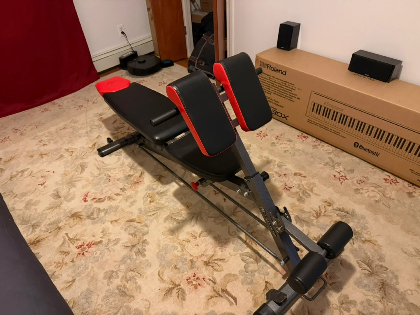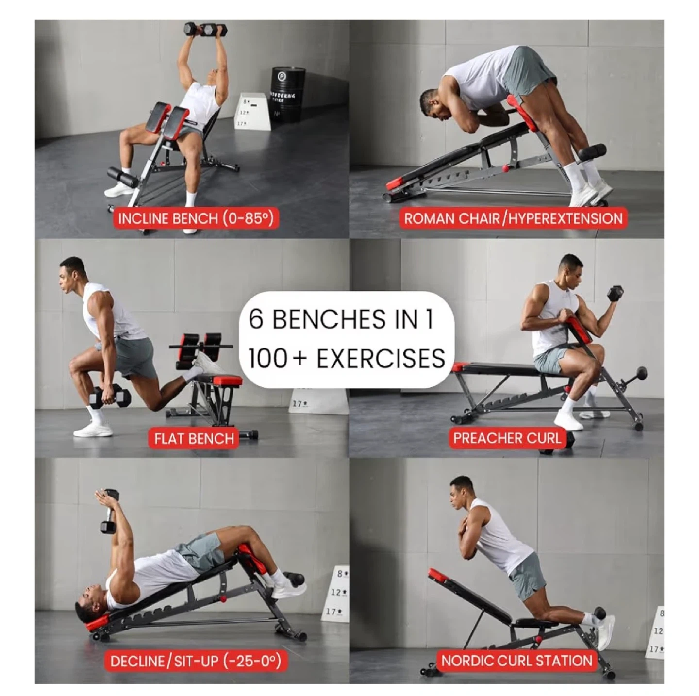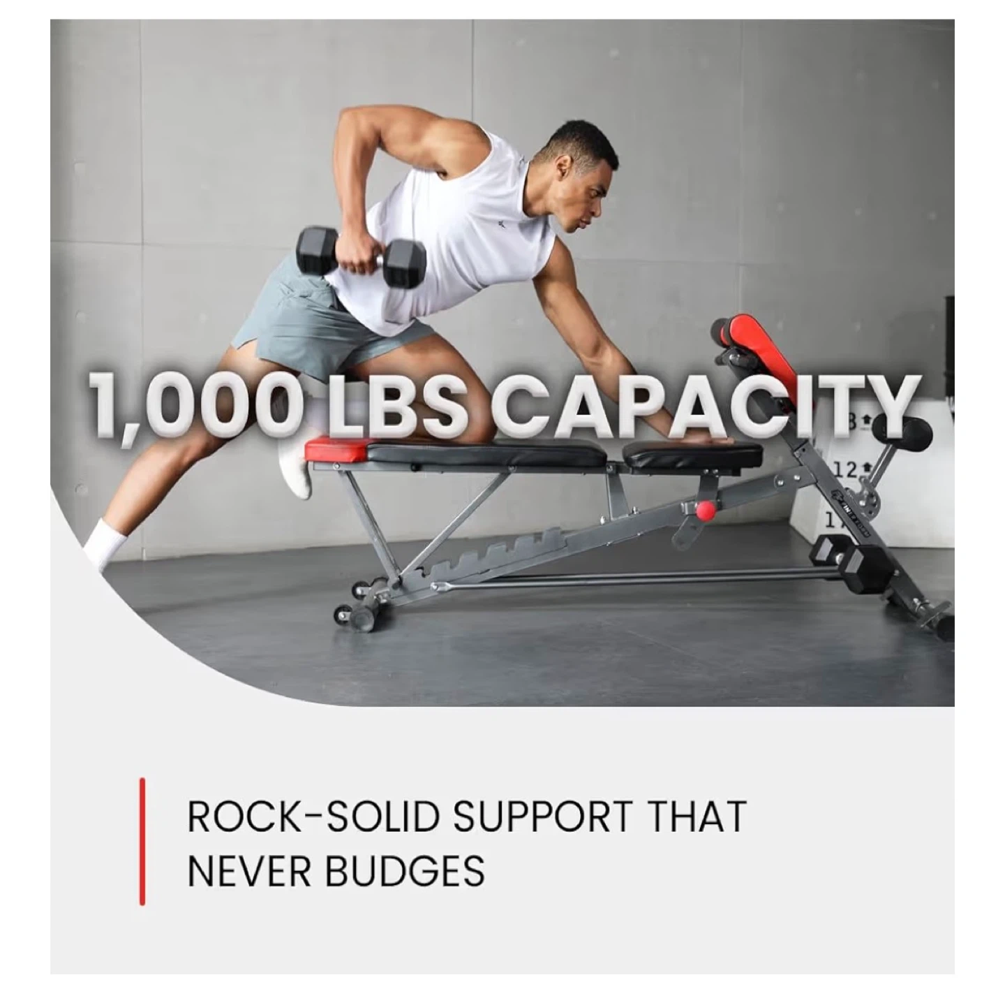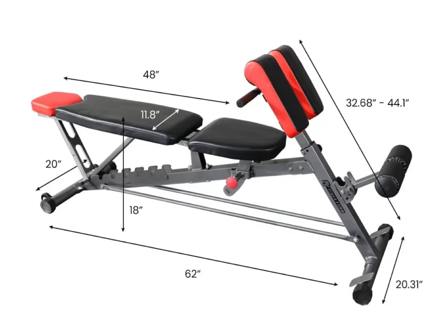 This versatile workout bench offers multiple configurations, including incline, decline, flat, and Roman chair positions. It's designed with a 1000 lbs capacity for robust support. Measures 62" L x 20.31" W with adjustable height from 32.68" to 44.1".
