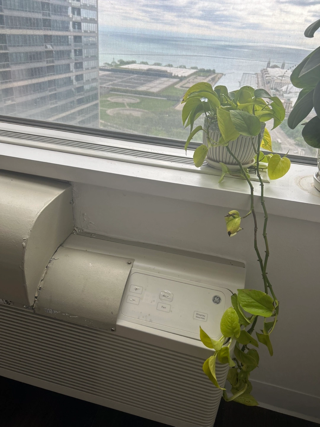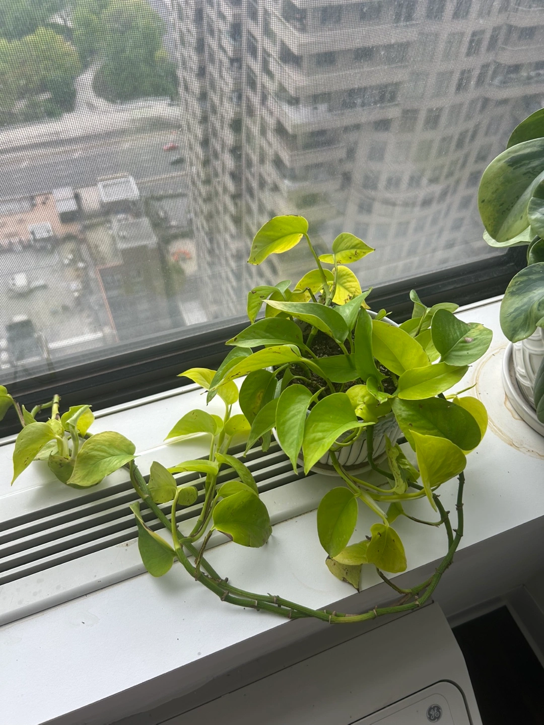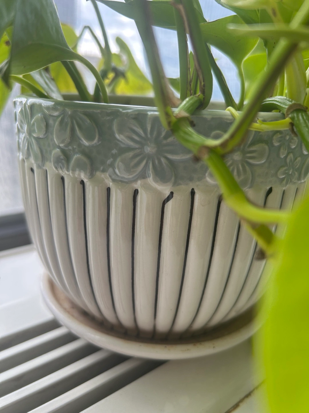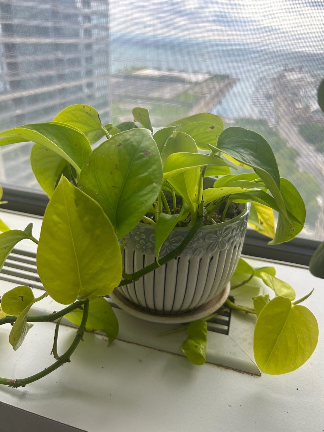 Healthy golden pothos in a ceramic pot. Features a light gray and white design. Plant trails nicely over the edge of the pot. Perfect for adding a touch of green to your home. Easy to maintain! Can be repotted into multiple plants