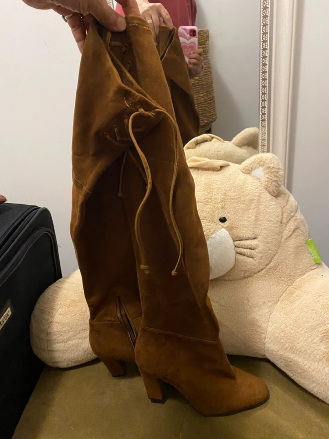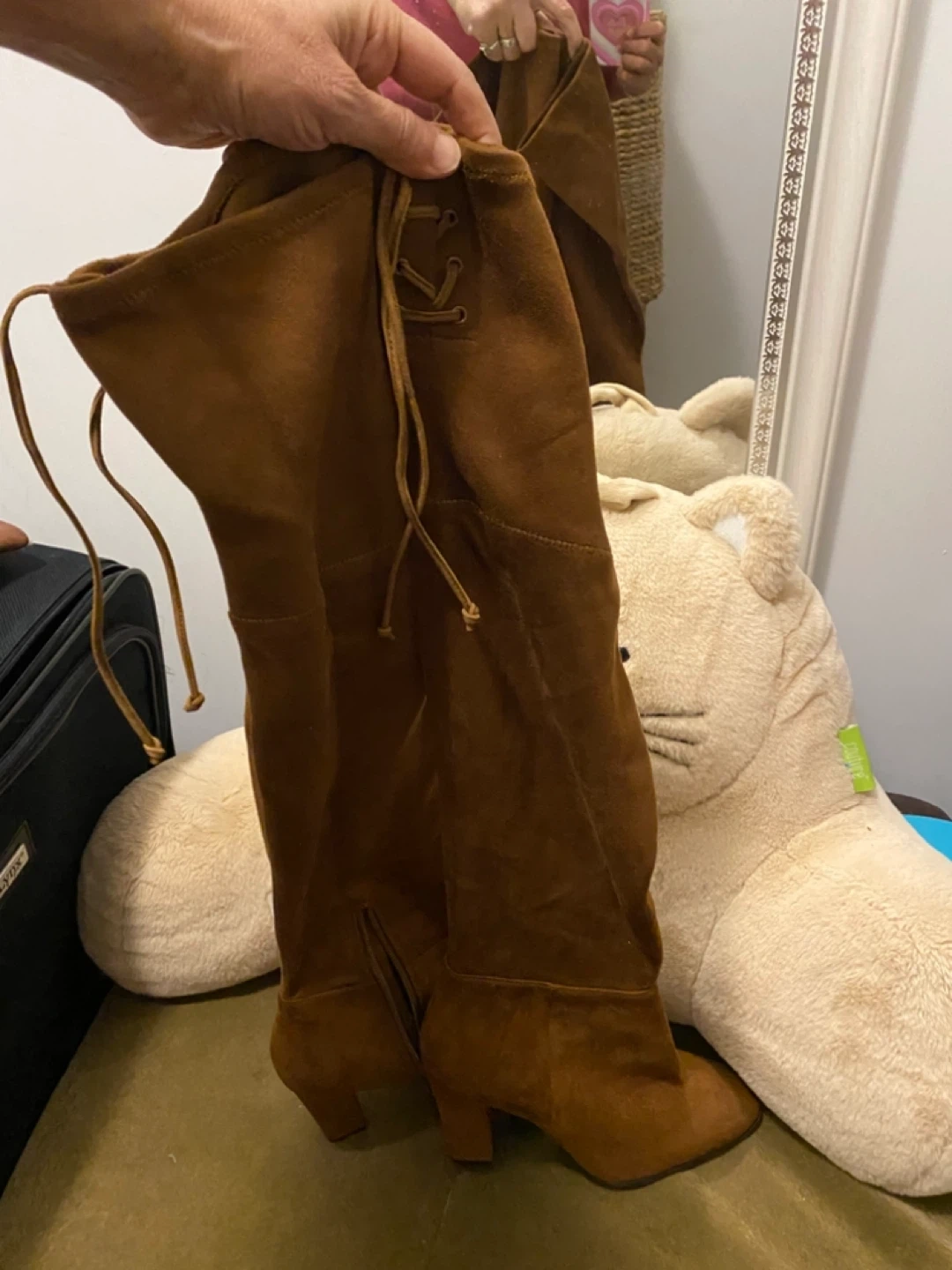Brown suede knee-high boots from Vince Camuto. These boots feature a side zipper and decorative ties at the top. The shaft is made of textile with a man-made sole. Heel height is approximately 3 inches.