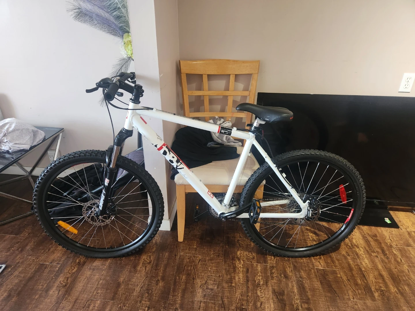 White mountain bike with disc brakes and knobby tires. Ready for your next trail adventure. It's suitable for various terrains. Brand new condition, never used