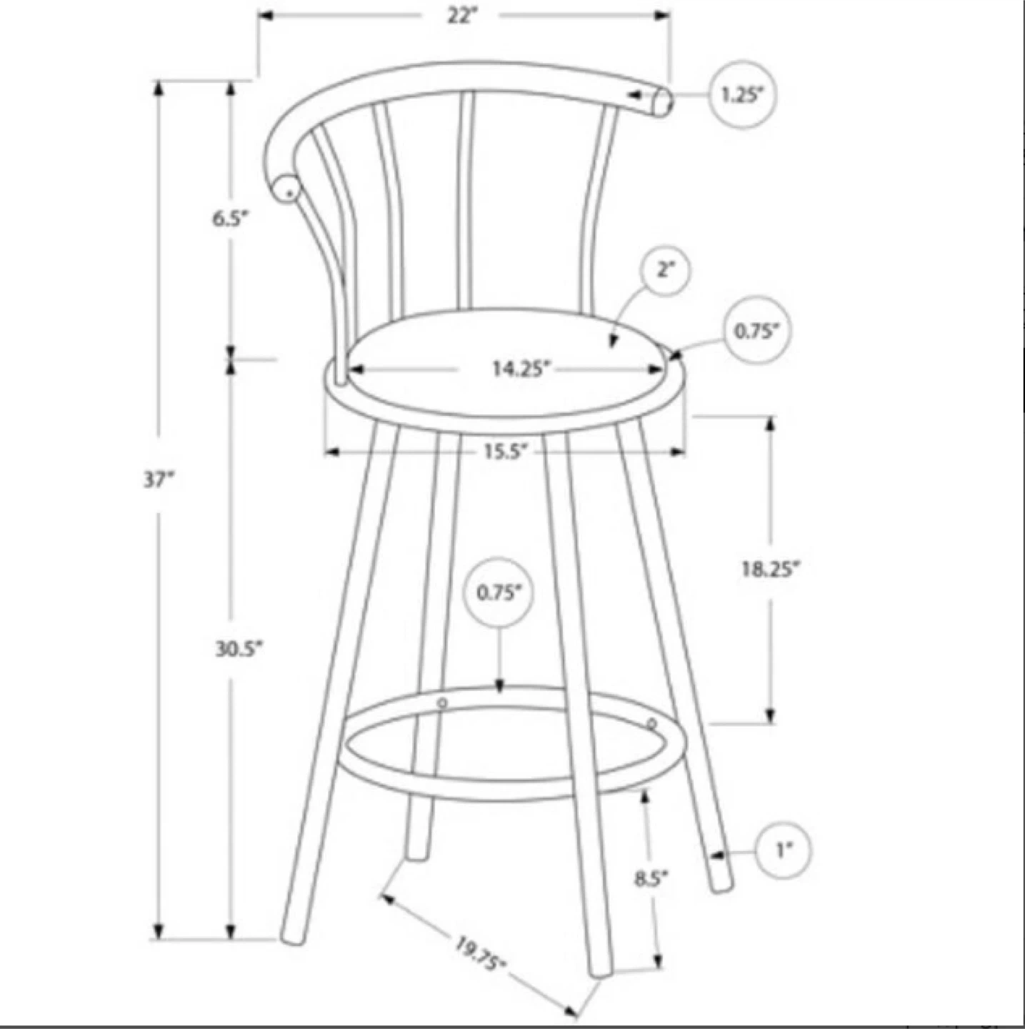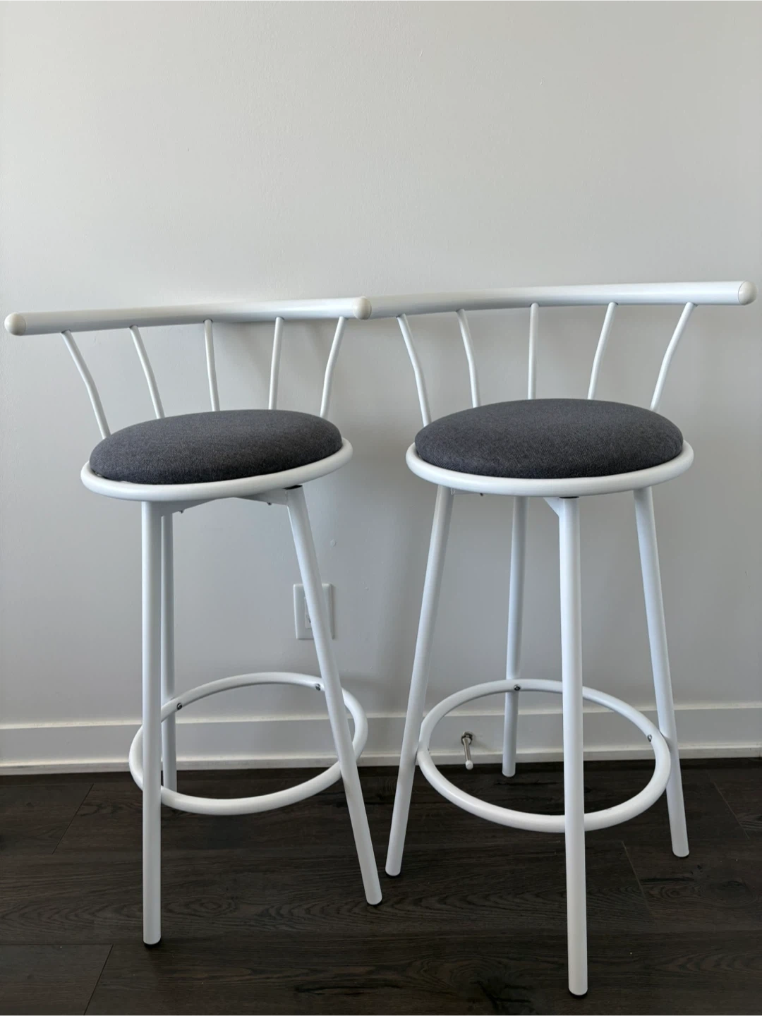Selling a set of 2 brand new and unused white bar stools. They come with grey upholstered swivel seats. See picture for dimensions.