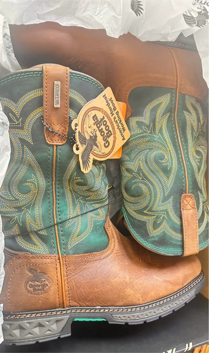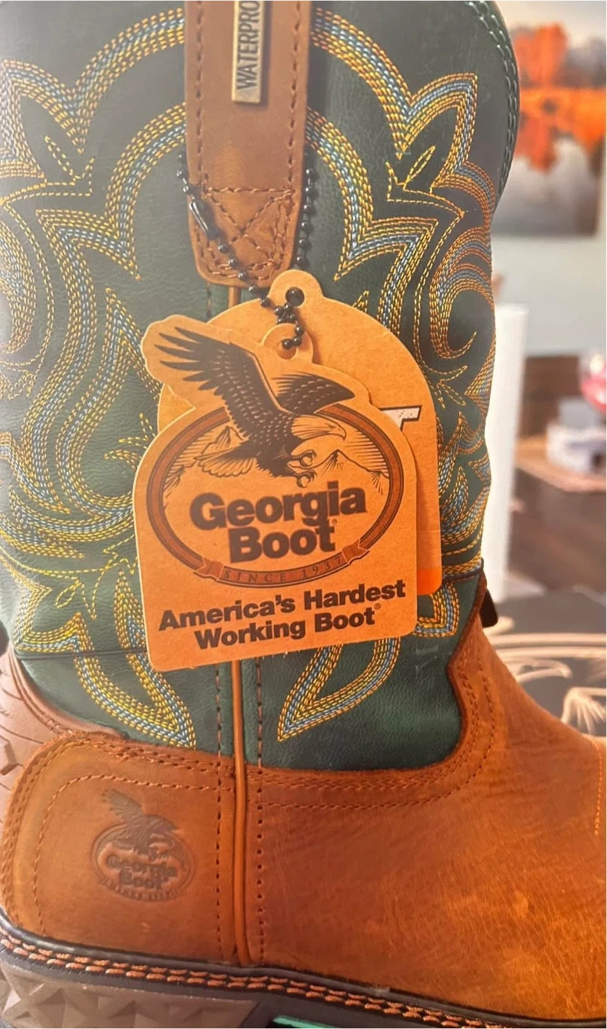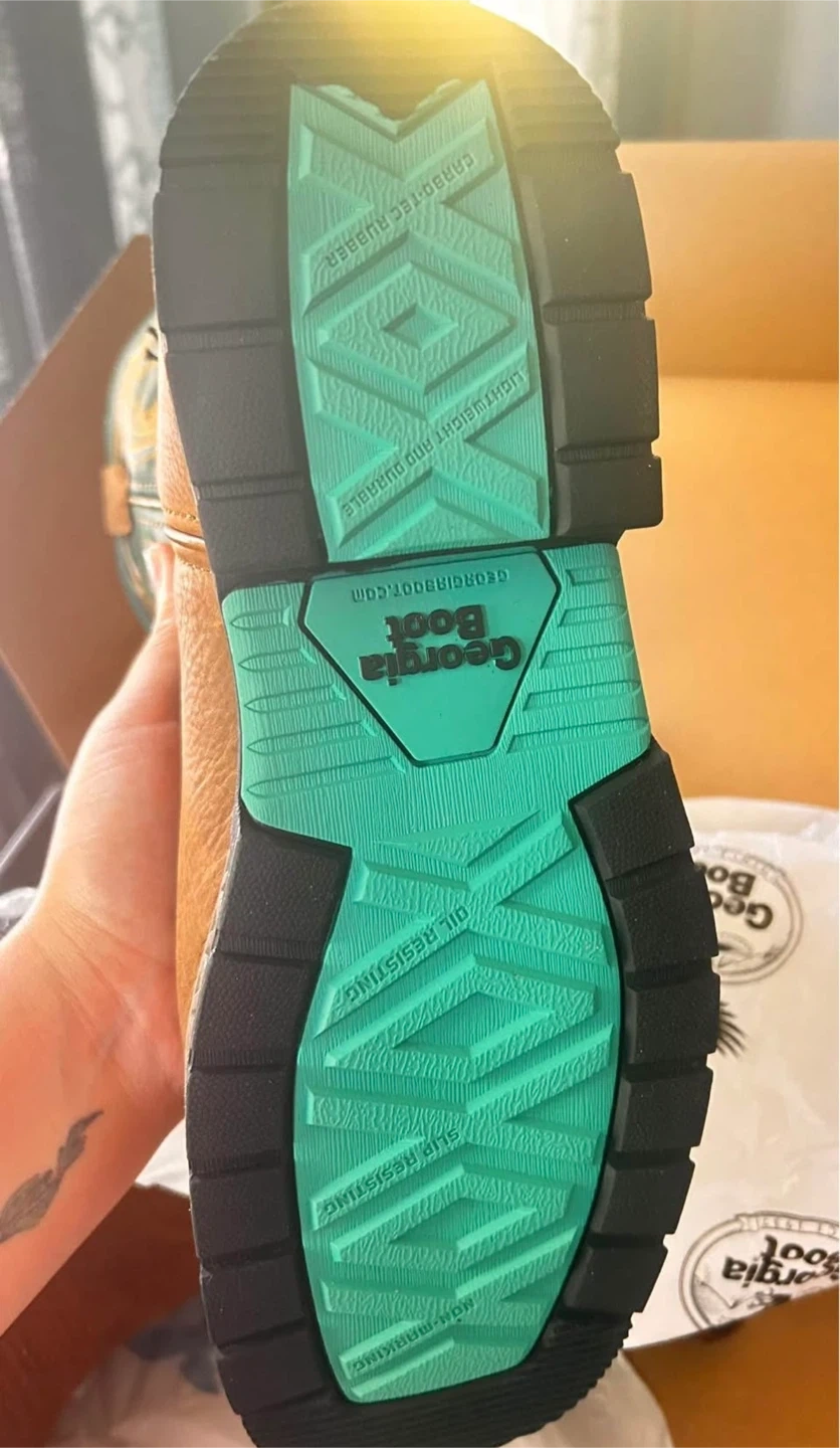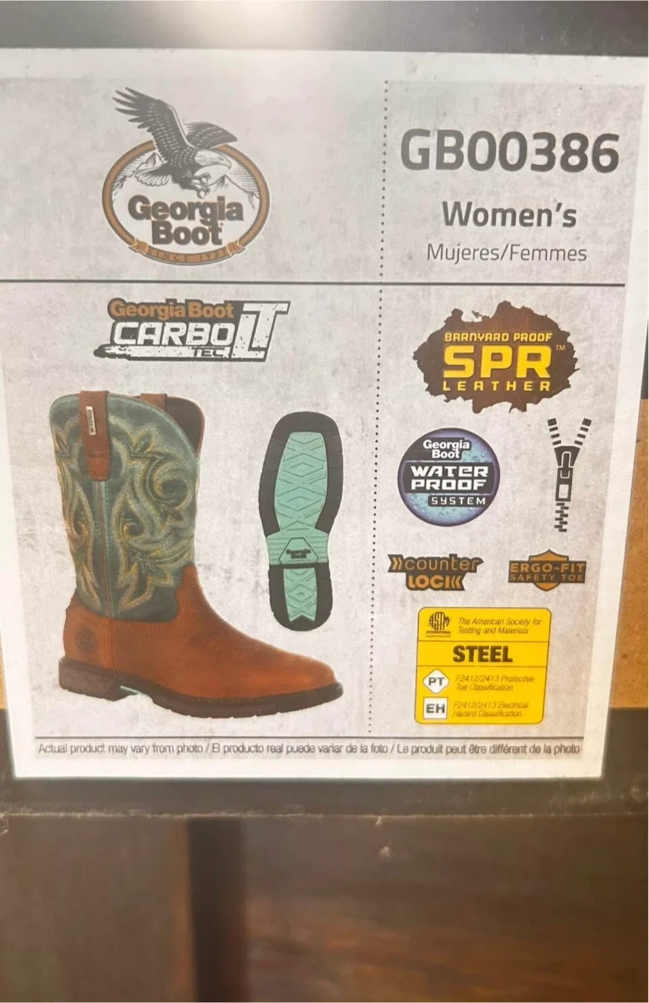 Selling a pair of Georgia Boot women's work boots! They are a size 8 and feature a steel toe for safety. These boots are waterproof and have SPR leather, making them durable and comfortable for long days on the job. The Carbo-Tec rubber provides great traction, and the counter lock design ensures a secure fit