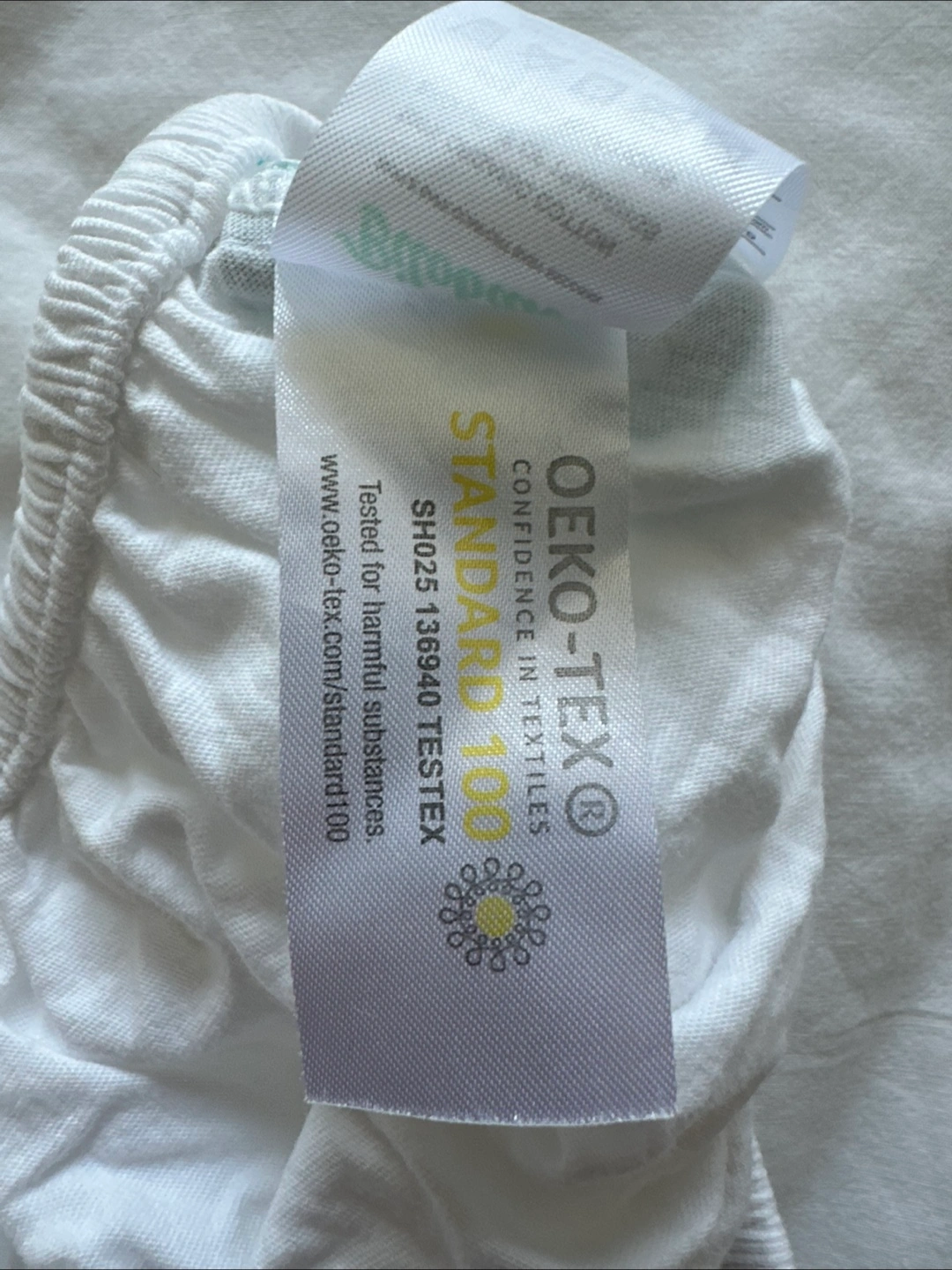 This is a Biloban fitted crib sheet. It's OEKO-TEX Standard 100 certified, ensuring it's tested for harmful substances. Made from cotton for a comfortable feel.