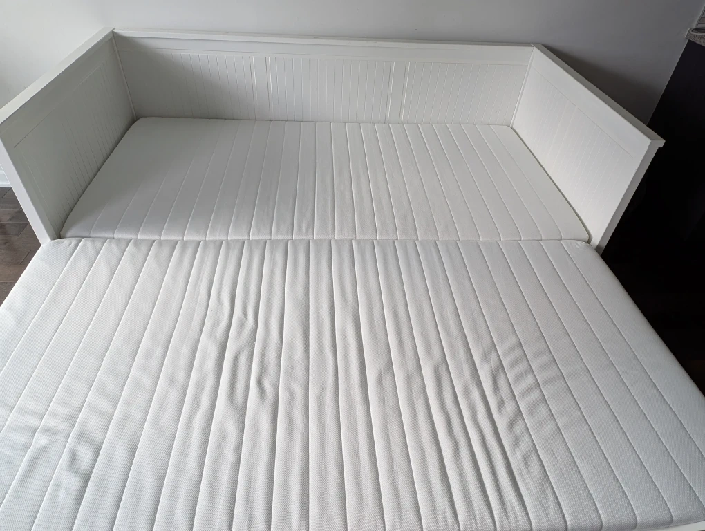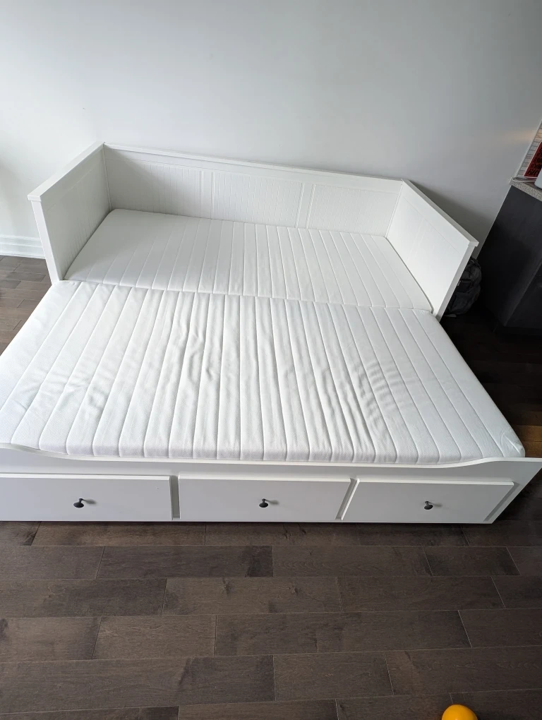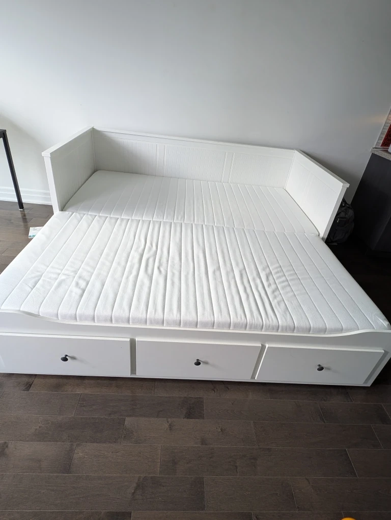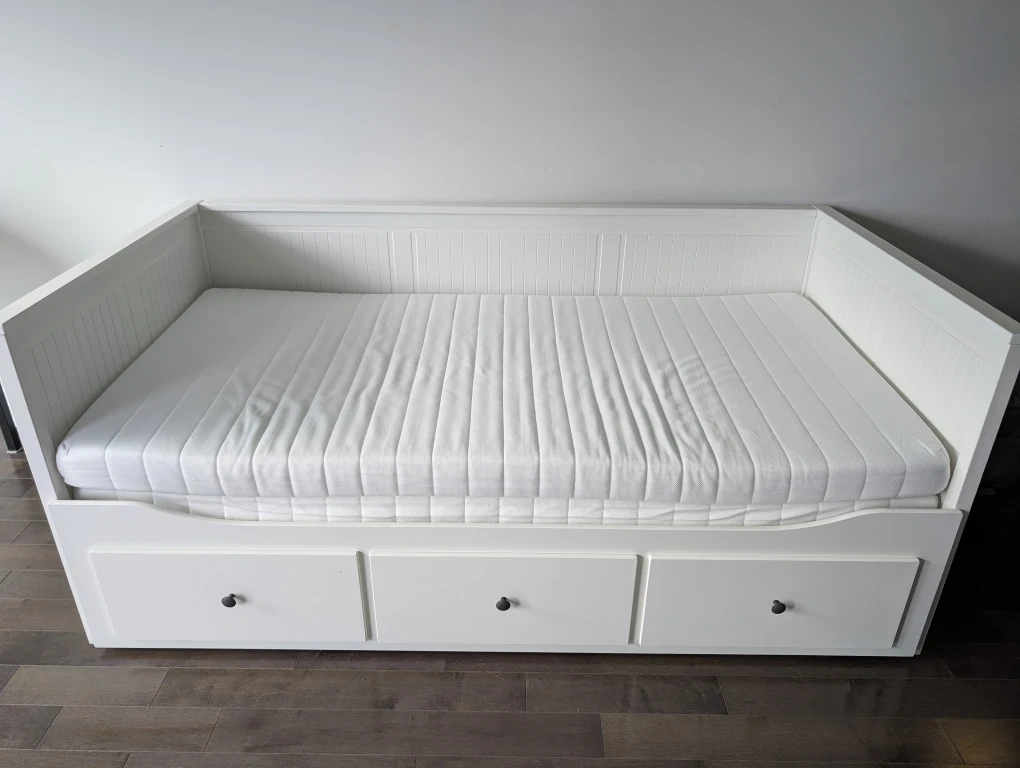 Selling an IKEA Hemnes daybed frame in white. It's in great condition and features three spacious drawers for storage. Perfect for a guest room or living space!