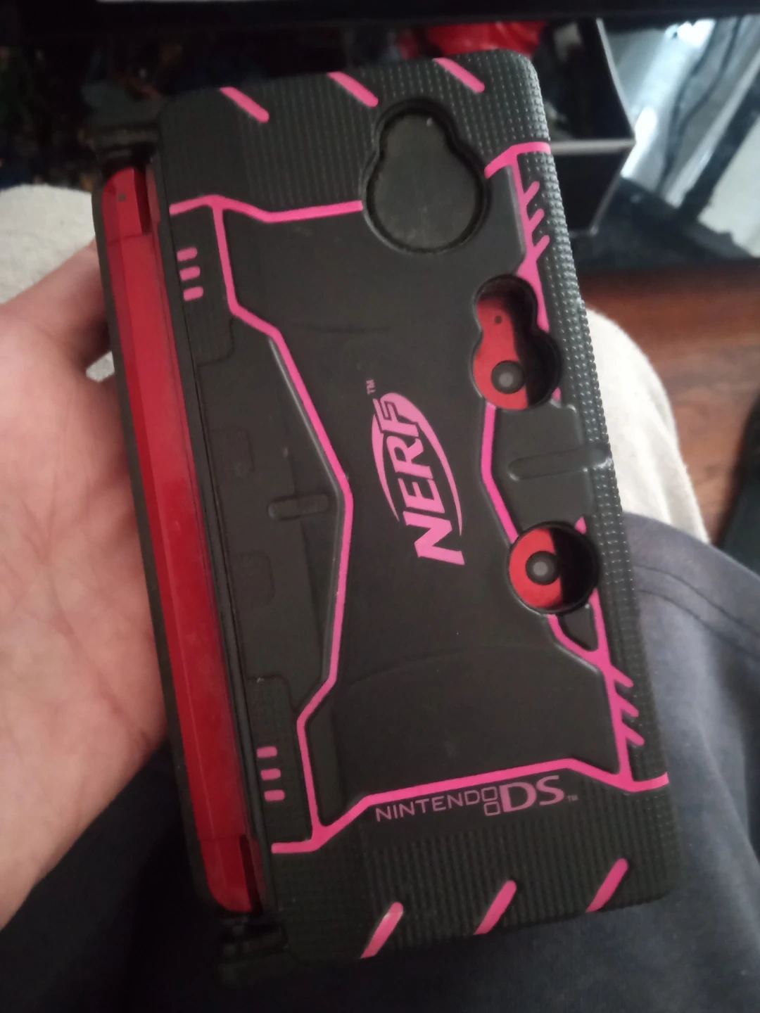 Awesome Nerf armor case is designed for the Nintendo DS/ 3DS and includes a large game storage bag. The case offers protection and a tactical look with its black and pink design. The storage bag holds numerous Nintendo DS/3DS game cartridges.Region-free and fully customizible system,
