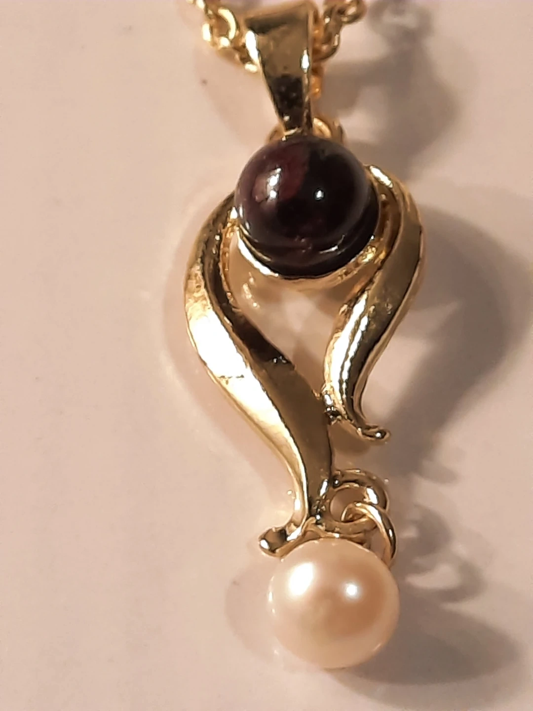 This 14K gold filled necklace features a pendant with a dark stone and a small real pearl. The chain is a delicate link style. It's perfect for adding a touch of elegance to any outfit! Stamped 14 k.pick up in oshawa.