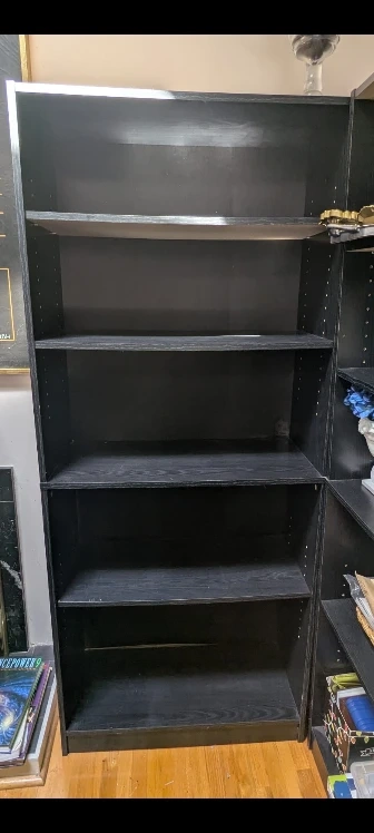Selling a black wood bookshelf. It's in good condition and ready for your books or other items!