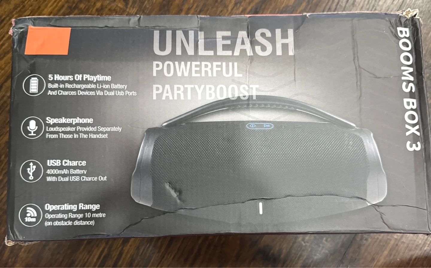 This portable speaker offers 5 hours of playtime with its built-in rechargeable Li-ion battery. It features a 4000mAh battery with dual USB charge out and an operating range of 10 meters. A speakerphone function is included.