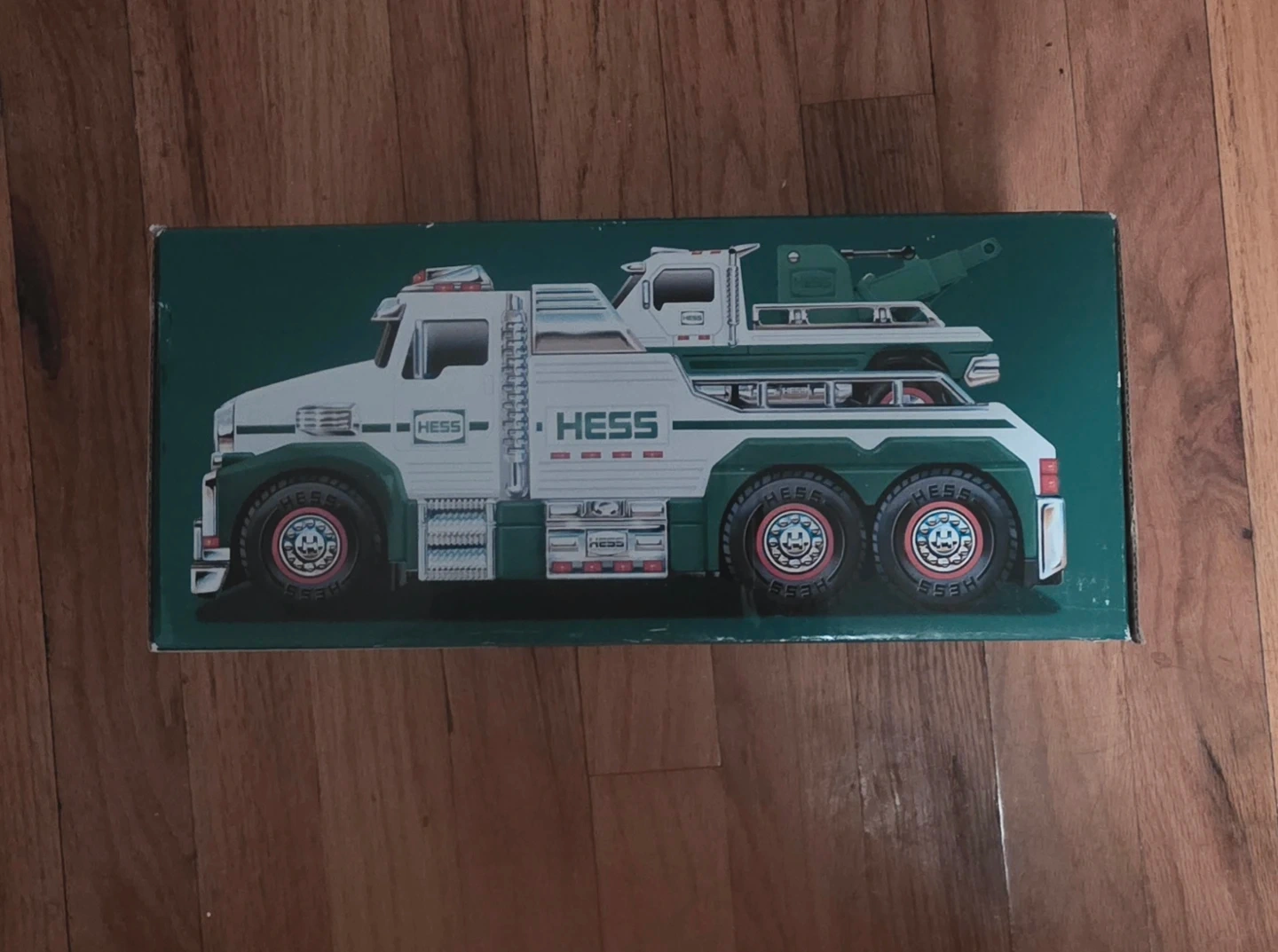This is a Hess 2019 Tow Truck and Car set. The truck features realistic sounds and flashing lights. It has a tow arm that can be extended and retracted.
