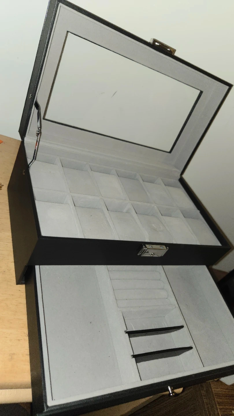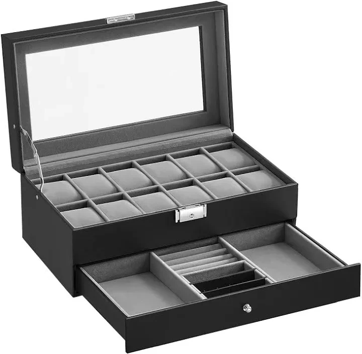 It has 12 individual compartments for watches and a drawer for extra storage.