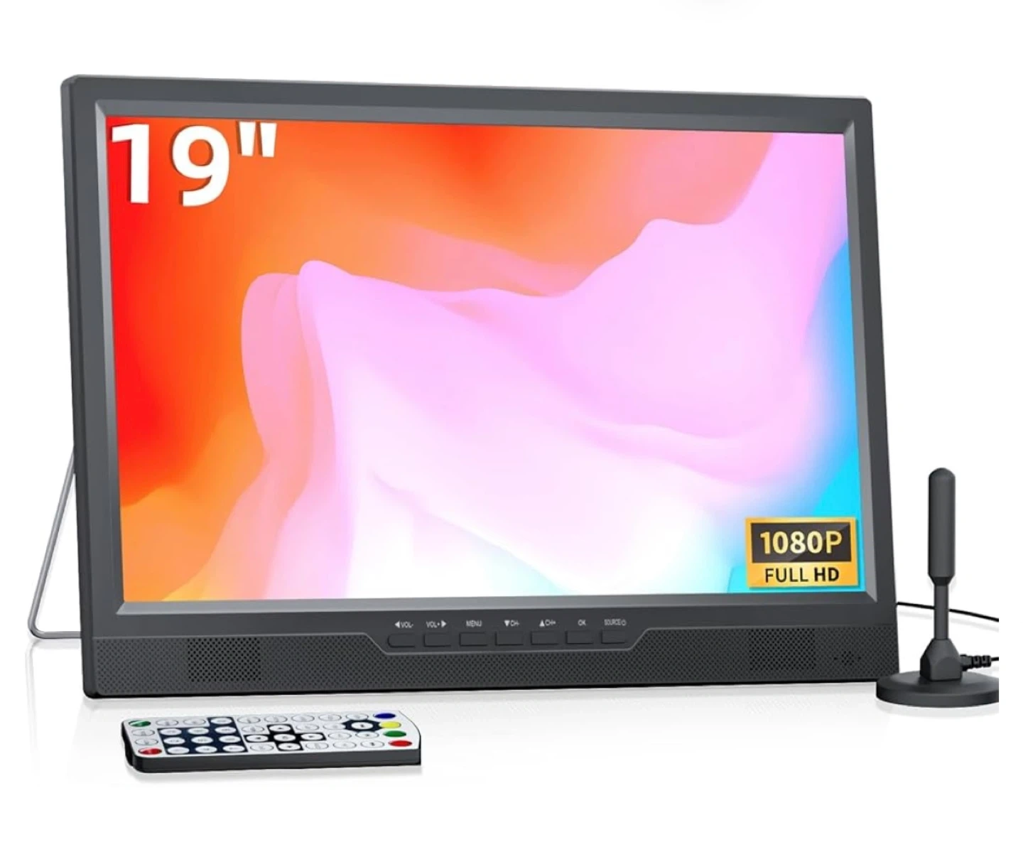 This is a 19-inch monitor with Full HD 1080P resolution. It comes with a remote control and an antenna. It's great for use as a secondary display or for gaming!