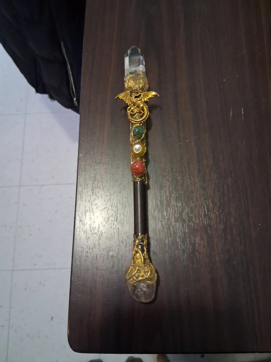 7 Inches tall Decorative wand featuring a clear quartz crystal point with a small pink gem and dragon embellishment. It's adorned with Carnelian Agate (root chakra), Yellow Agate (sacral chakra), and Green Chalcedony (heart chakra) along the shaft and a large clear quartz crystal at the base. This piece is great for display, alter work or as a unique prop for cosplay!