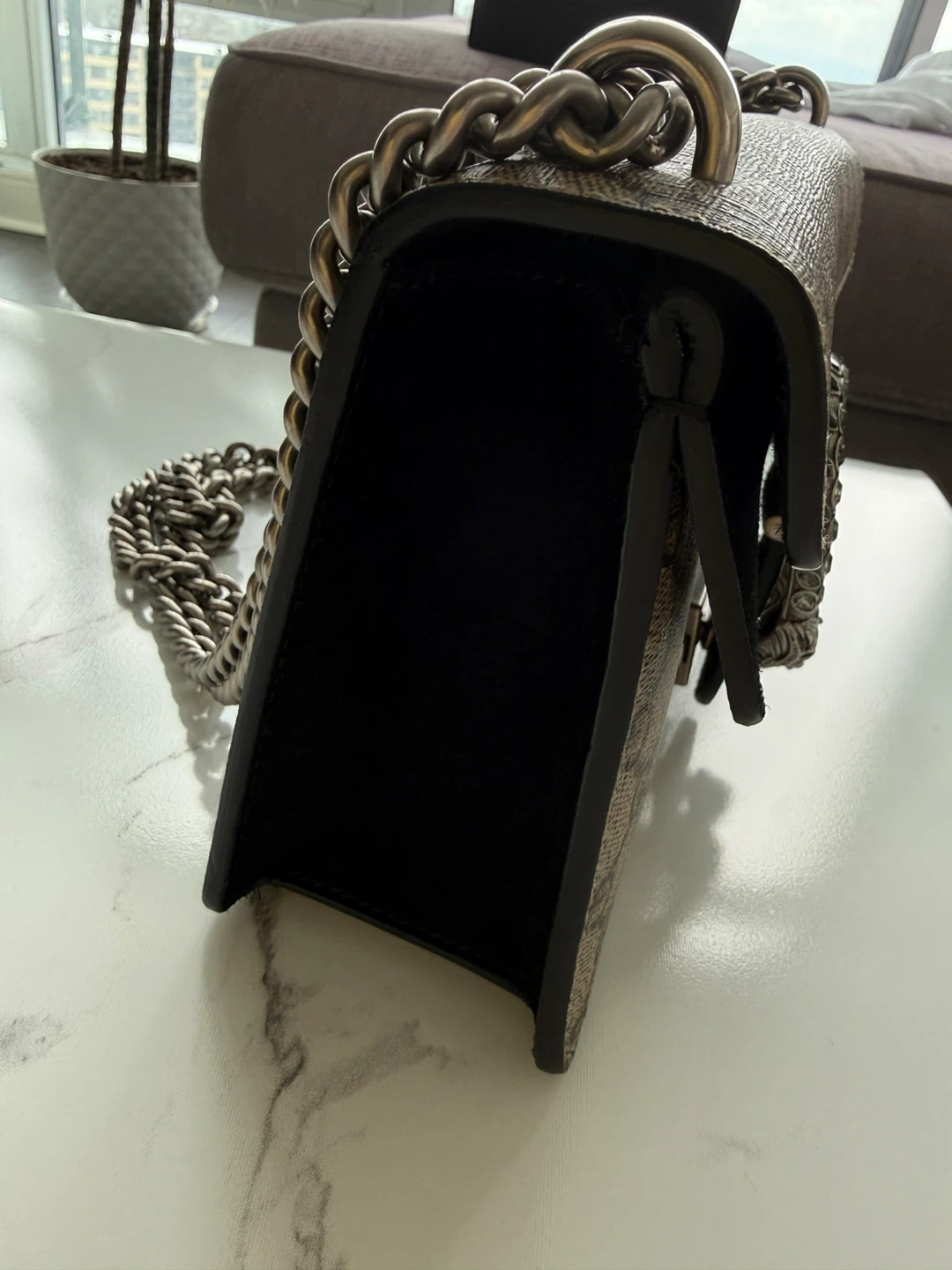 • Sliding chain strap can be worn as a shoulder strap or cross-body with 23" drop or can be worn as a top handle with 12.5" drop
