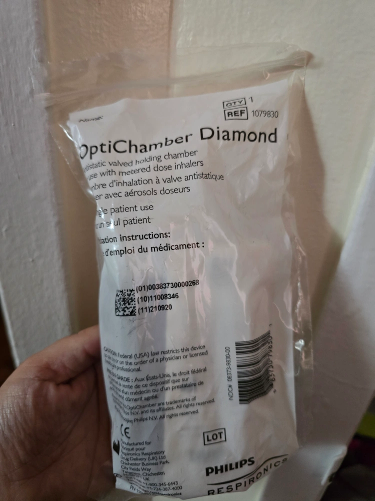 New, unopened OptiChamber Diamond valved holding chamber for use with metered dose inhalers. Designed for patient use. Includes instructions. Purple.