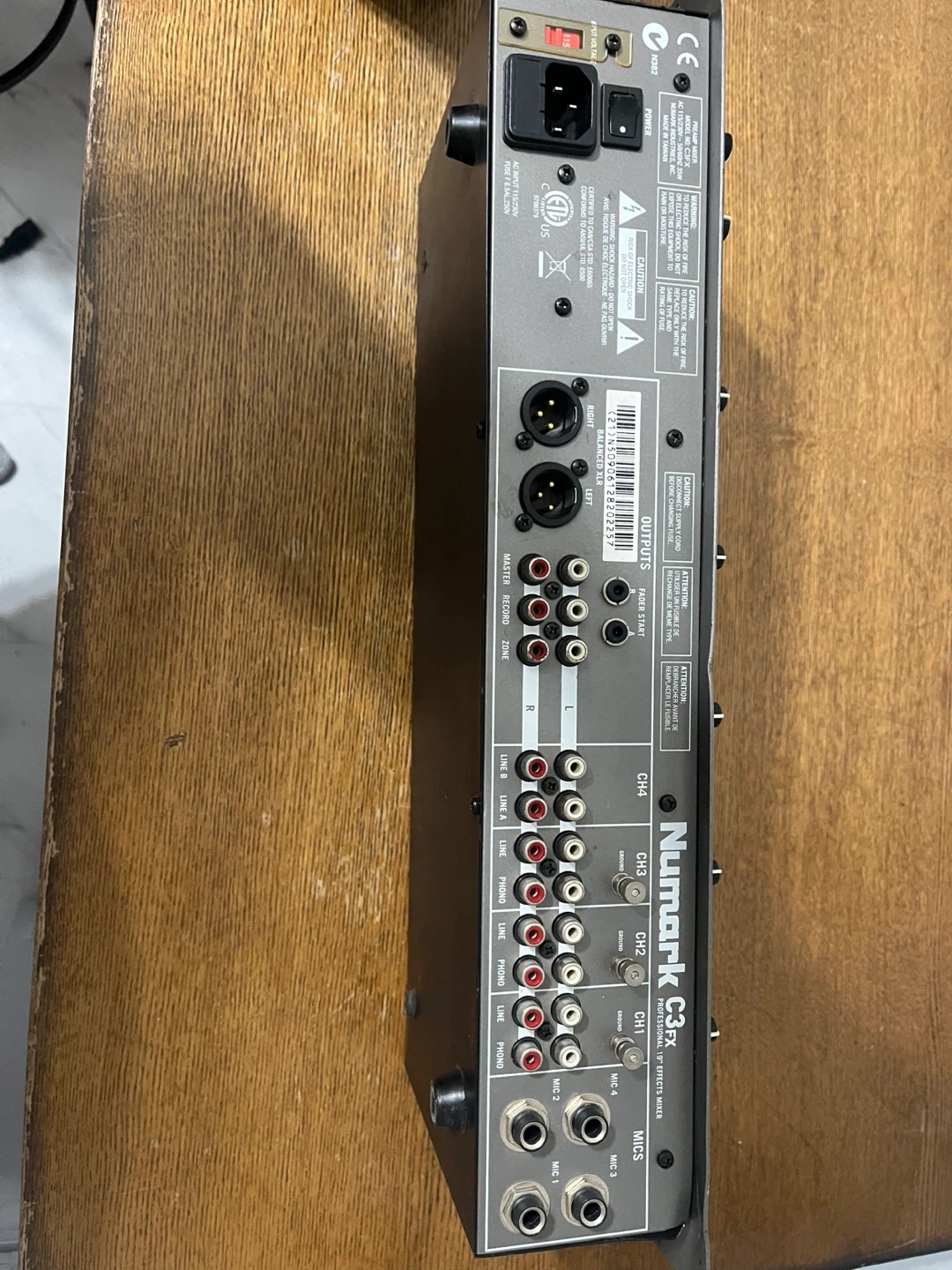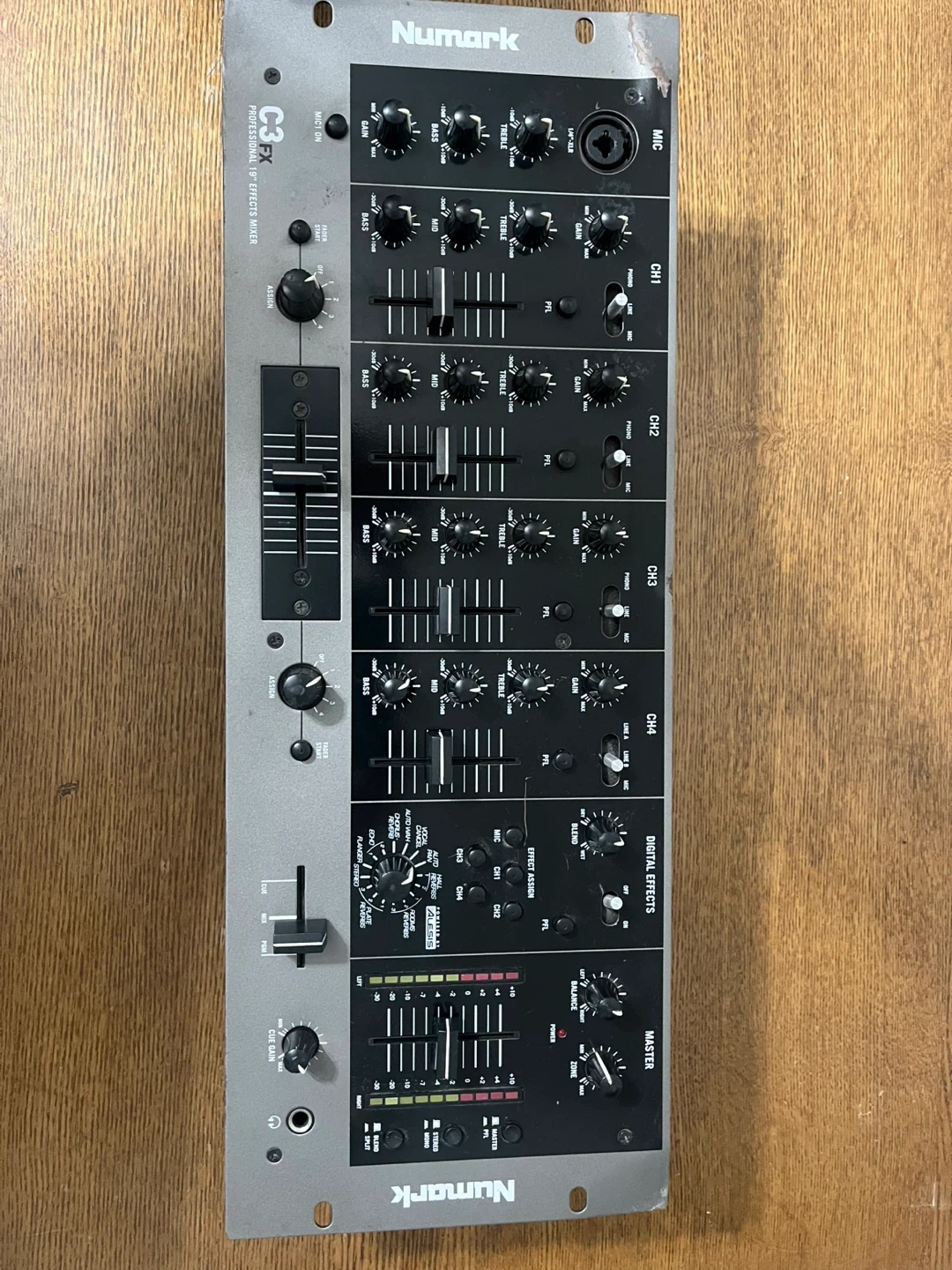 This is a Numark C3FX Professional DJ Mixer. It's a 4-channel mixer with digital effects. It has a durable metal construction.