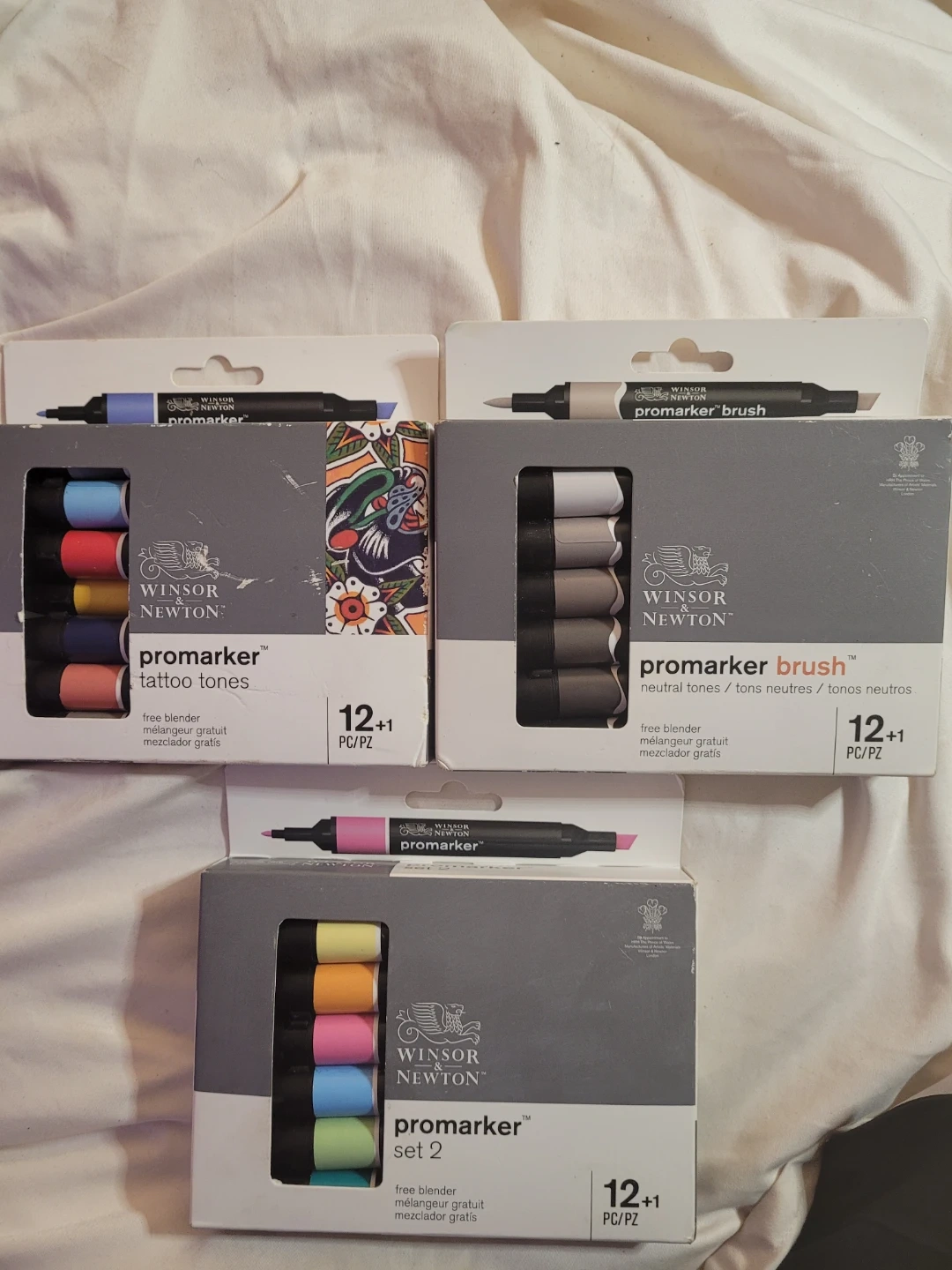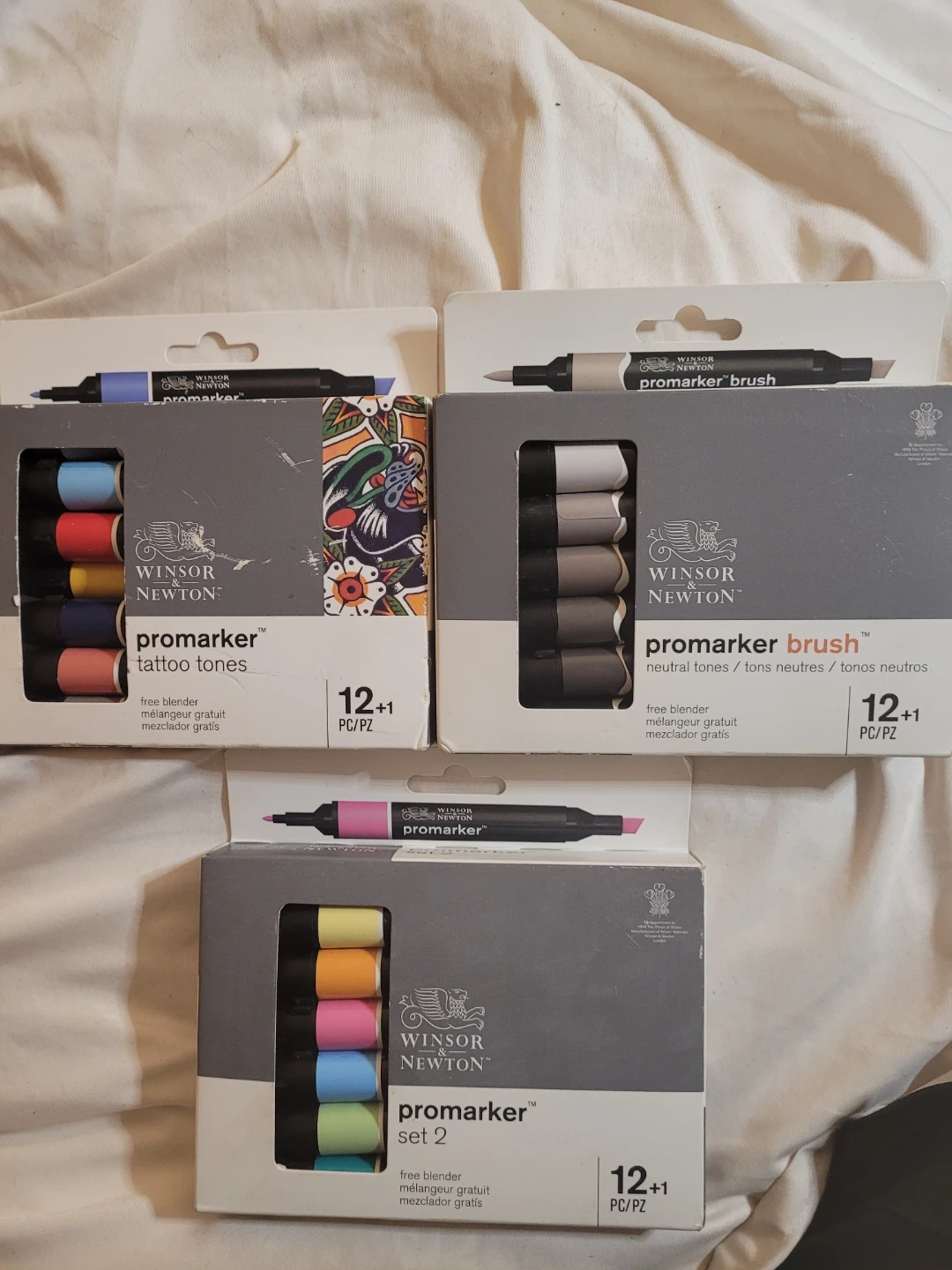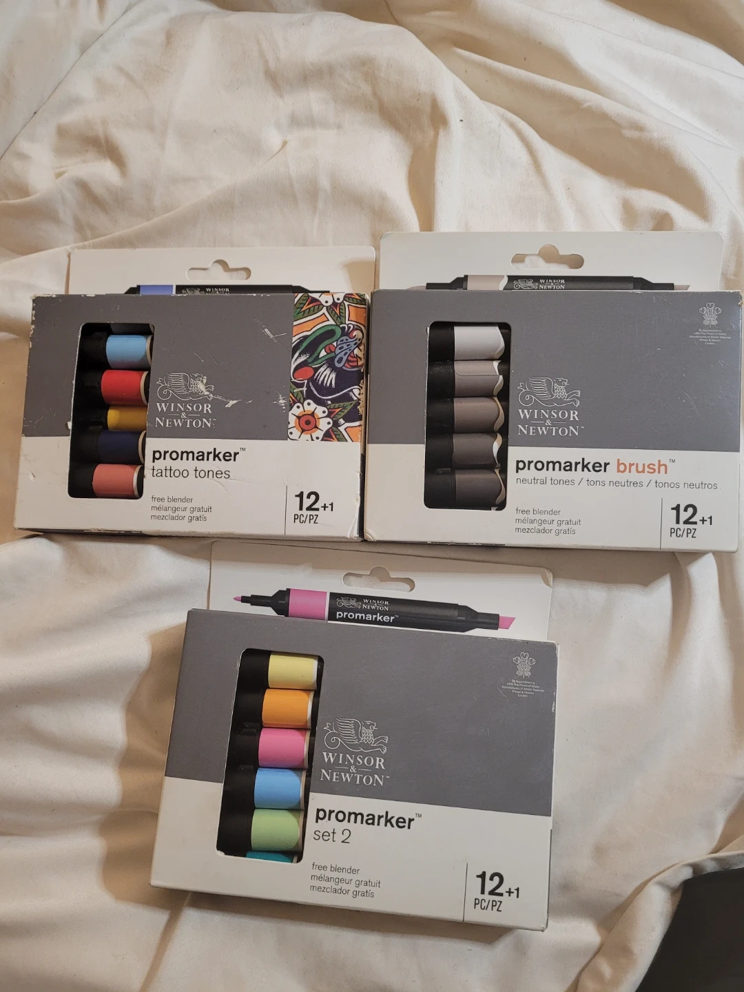 Selling individually three sets of Winsor & Newton ProMarker markers, including 'tattoo tones', 'neutral tones' and 'set 2'. Each set contains 12+1 free blender markers. Perfect for artists and crafters looking to add a range of colours to their toolkit. Open to offers and trades.