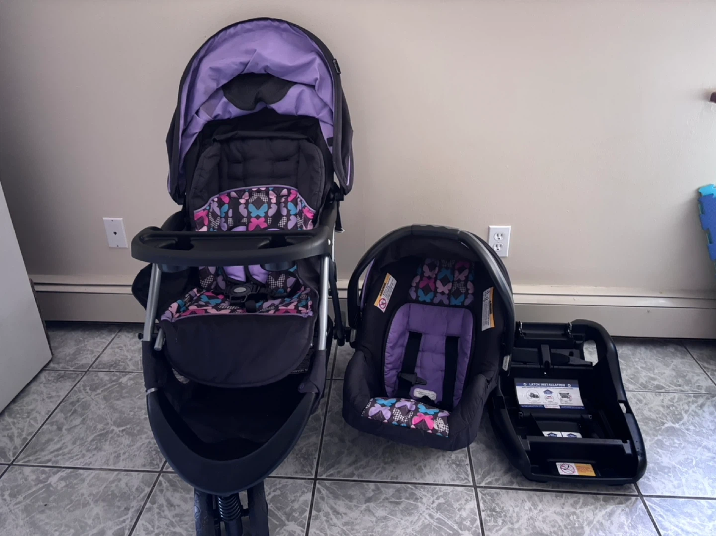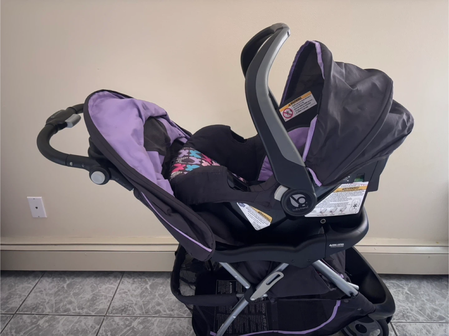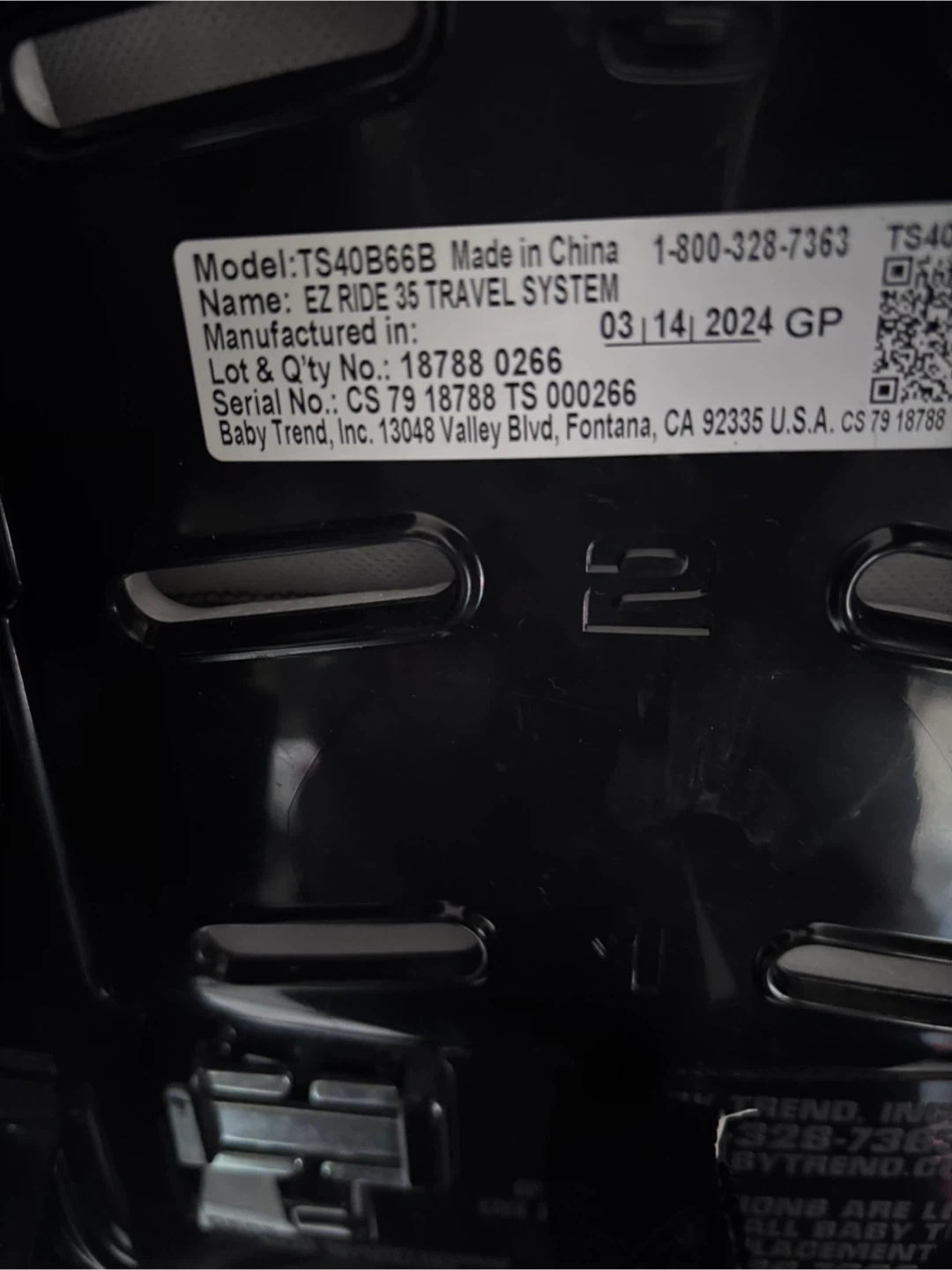Baby Trend EZ Ride 35 Travel System includes stroller and car seat. Car seat is for children 4 to 35 lbs and 32" or less. Stroller has a snack tray. Manufactured in March 2024.