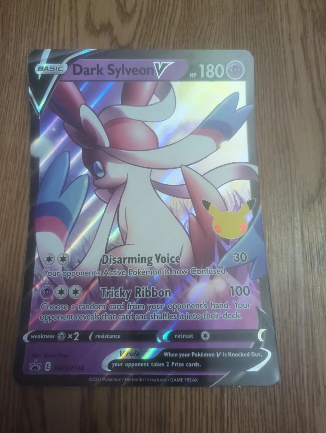 Selling a Dark Sylveon V Pokemon card. It has the attacks Disarming Voice and Tricky Ribbon. When your Pokémon V is Knocked Out, your opponent takes 2 Prize cards
