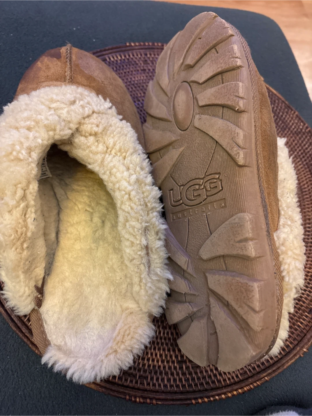 Selling a pair of UGG Scuffette II slippers in a women's size 7. These slippers are super cozy and perfect for wearing around the house. They show some signs of wear, but still have plenty of life left!