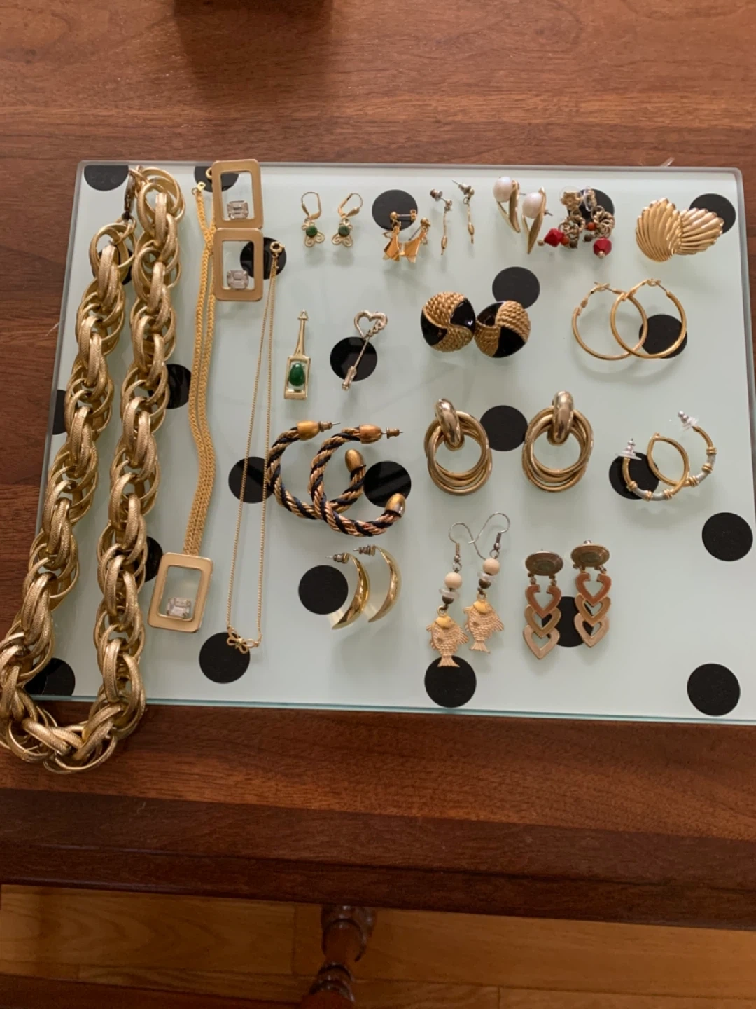 Selling a collection of vintage gold tone jewellery. There are a variety of earrings, necklaces, and a bracelet. Perfect for adding a touch of retro style to any outfit!