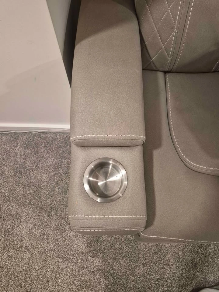 Features adjustable headrests, USB charging ports, and cup holders. Color is grey, approximately 84 inches wide. Limited use as it was kept in the basement. No rips.