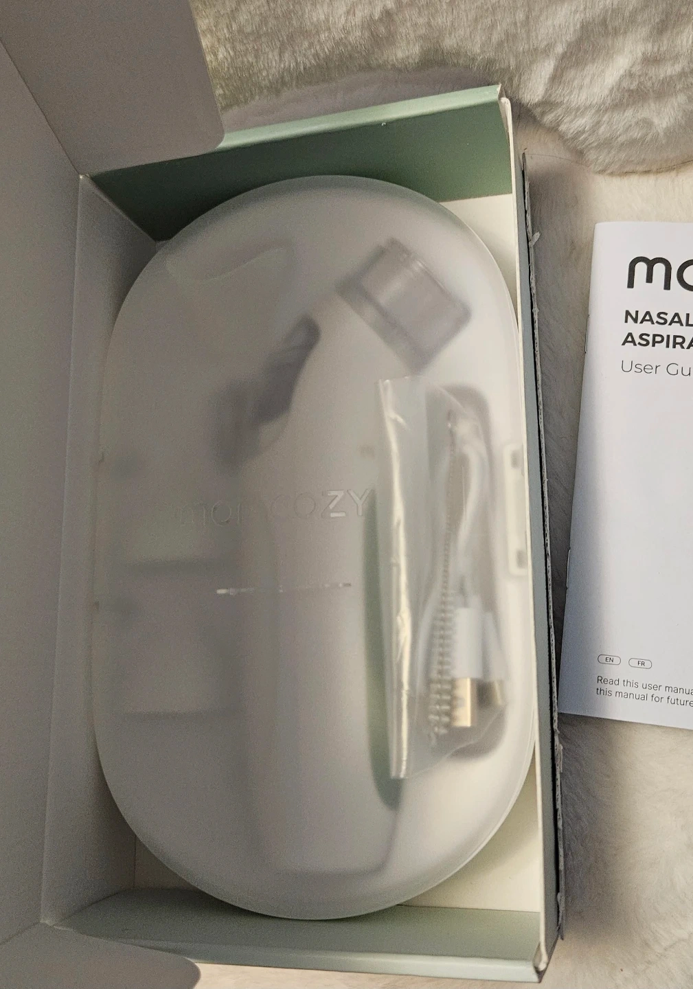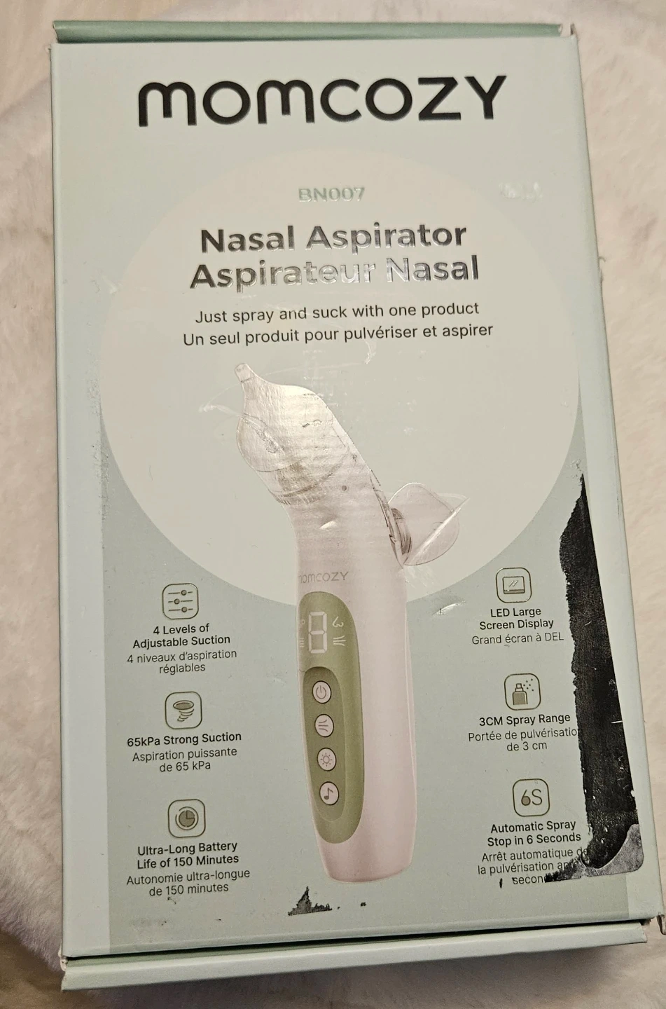 Momcozy nasal aspirator with 4 levels of adjustable suction. It has 65kPa strong suction and a 3cm spray range. Ultra-long battery life of 150 minutes. Features an LED screen and automatic spray stop in 6 seconds.