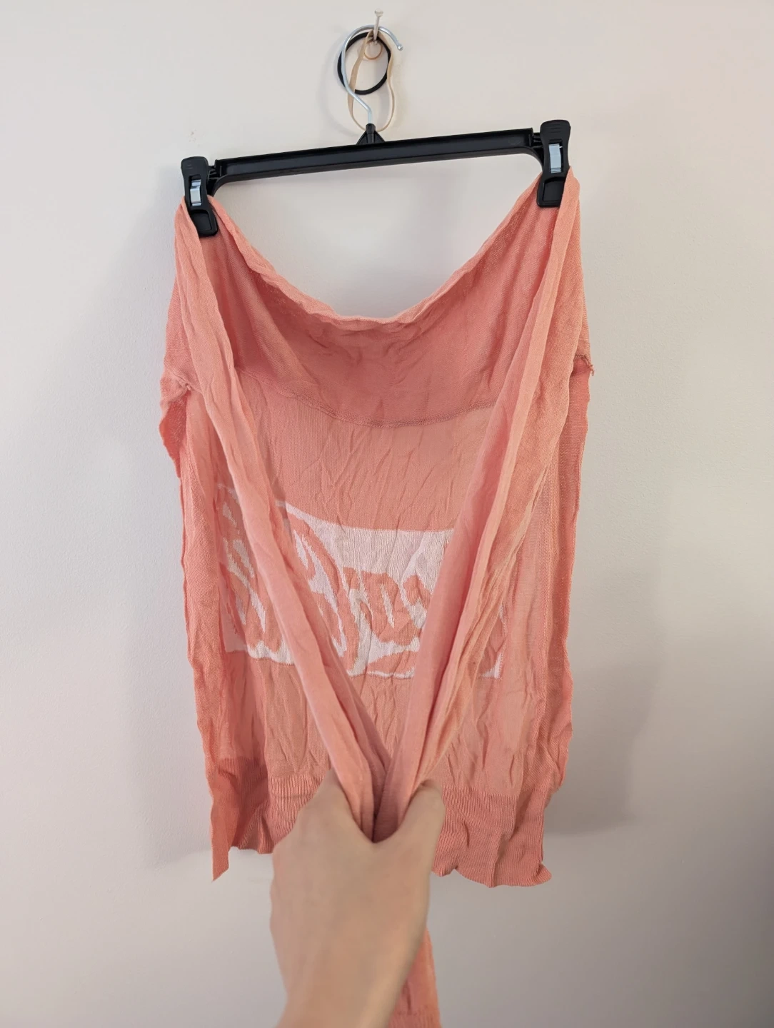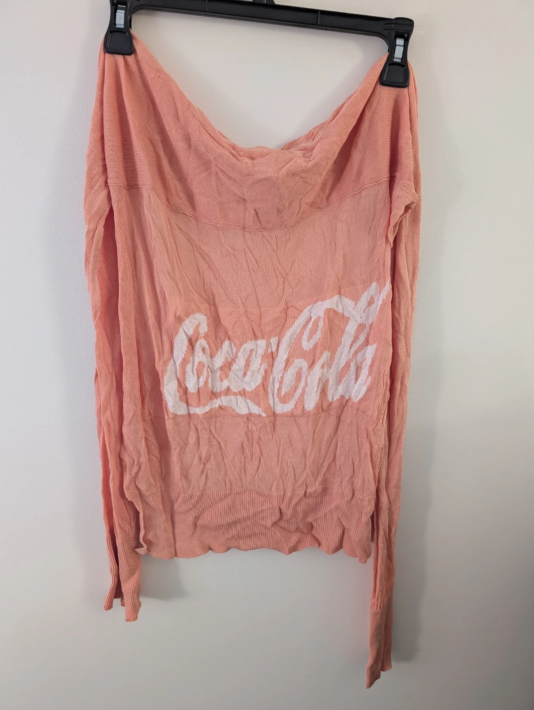 This is a pink knit top with the Coca-Cola logo on the back. It's lightweight and has long sleeves. The material appears to be a blend of cotton and polyester.
