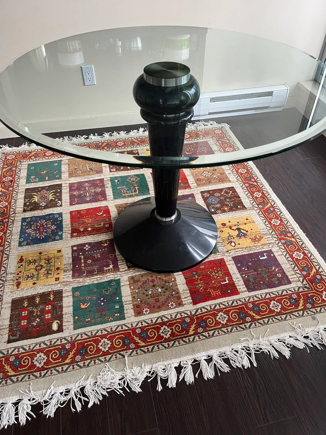 Selling a round glass top dining table with a stylish black base. It's in great shape and would be a lovely addition to any dining space!