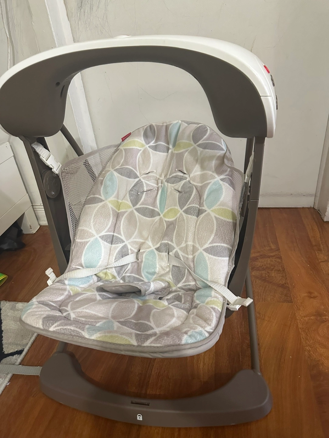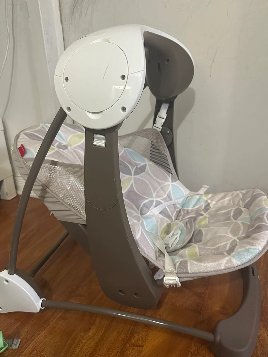 Baby swing, gently used. Features multiple speeds and soothing sounds with music, white noise and vibrations. Grey and white colour scheme. Includes removable seat pad. It needs battery change. Pick up. Cash only. Scarborough